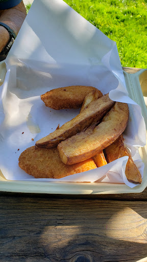 Food thoughts: The jojos and tartar sauce are indeed good. The fish was a white fish (tilapia I'm guessing) in a thicker shell that was new to me. As delivered, they are poofy with a good amount of air between the fish and batter.