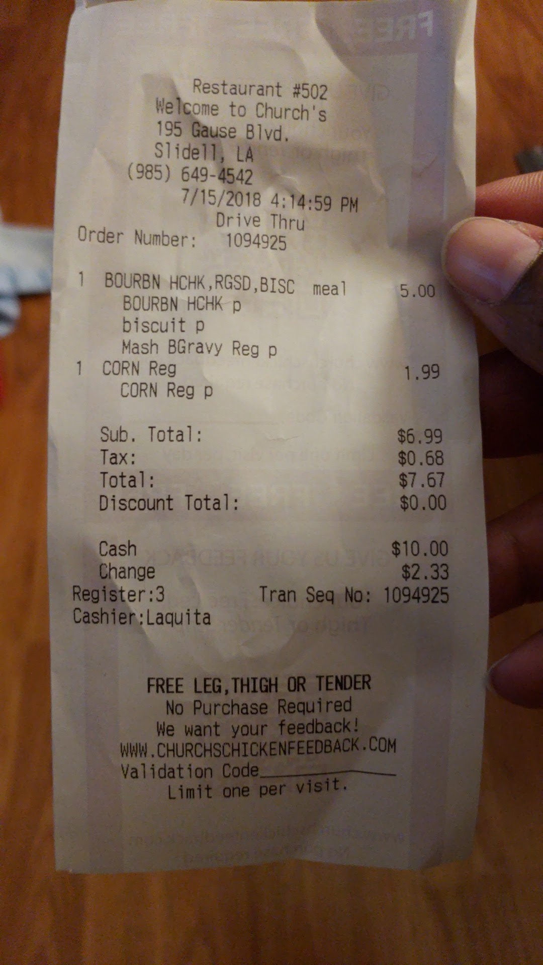 Read moreAnd I'm being generous about that star. Church's Chicken used to be our favorite place for chicken. I think today finally ended that. Went to try the new grilled chicken. It's a half chicken, one side order and busciut. First off I understand small chickens but I've seen bigger pigeons. But I could not believe it was a half of a chicken. It only took up half of the small box. The only part that was the breast peice was smaller than my fist and it was split open and so dry I couldn't pull it apart to split it for my two dogs. The edge of all the rest was too dry. I don't know if it was supposed to be bbq sauce but if it was it was like water. They set the buscuit in it and it was all soggy. I myself think it was grease because the outside of the box was coated with it. Very disappointing because we always went there. No body cares anymore I would never serve anybody a peice of chicken that looked like that. I've had plenty of orders that were messed up, which never surprised me but inedible food is not acceptable. We are going to miss it too. Popeyes it will be from now on. What a shame. I'd bet they wouldn't like it it was served to their family. Sorry for such a bad review but when you spend your money for food, you would hope to be...