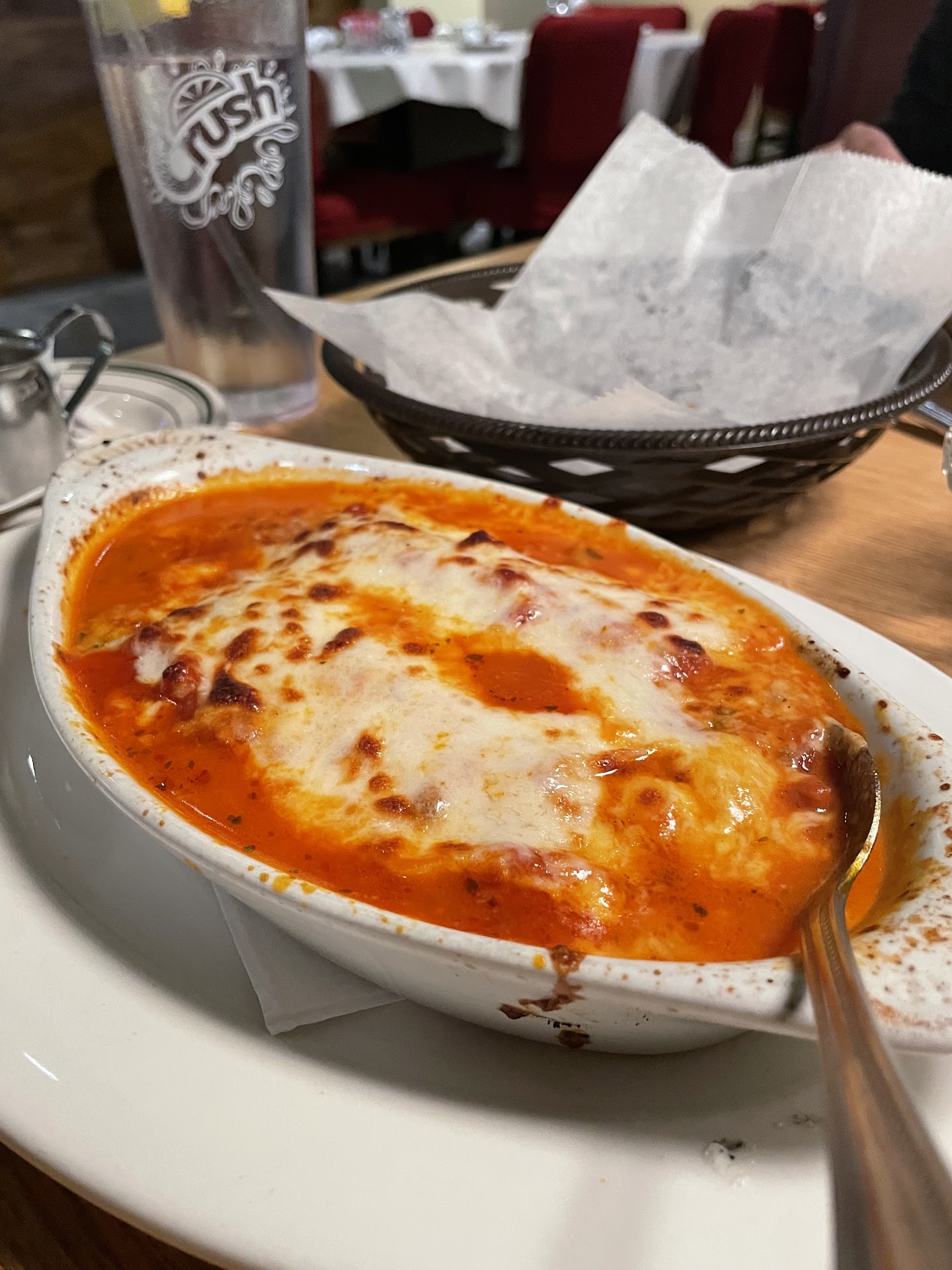 I ordered a chicken parmesan because I was craving something simple, although I initially came for pizza. The chicken was perfectly cooked, and had two hand sized portions of thin cut chicken filet. I chose angel hair with my chicken parmesan and the amount of sauce was perfect for me. Portion is large, and the cost is very reasonable. Other options include ziti and spaghetti. I ate half of my plate.