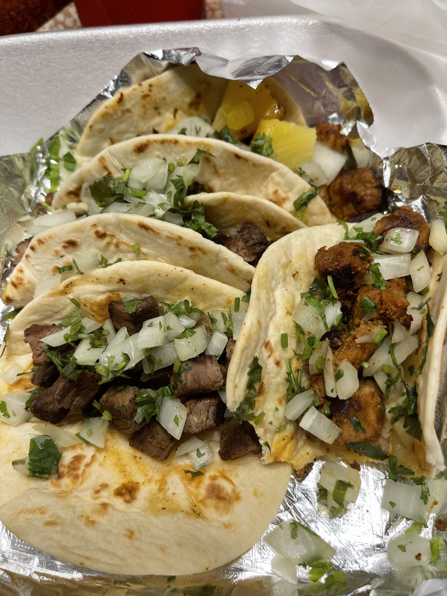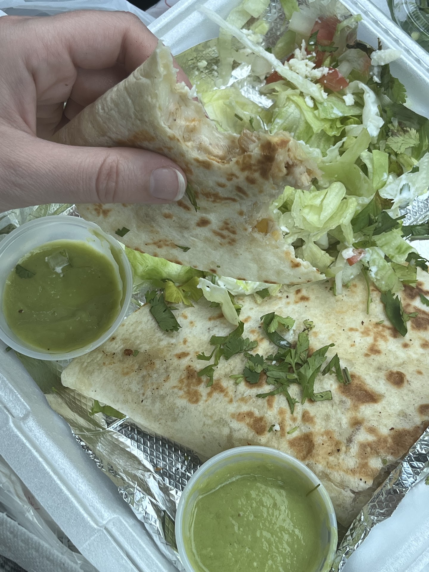 Food was not served as advertised. We ordered a chicken taco and two chicken quesadillas, and the menu on the truck said it comes with pico de gallo, sour cream, guac, and salsa of choice. They must’ve ran out of salsa because they gave us another guac instead. The guac was like an avocado lime puree, it was liquidy and seemed store-bought. The pico was not pico, it was just a few pieces of plain diced tomatoes and onions on top of a bed of shredded lettuce. The sour cream was just a garnish, not a portion. I also ordered a side of cilantro, but what I got did not smell fresh. There were a couple rotten leaves in it.