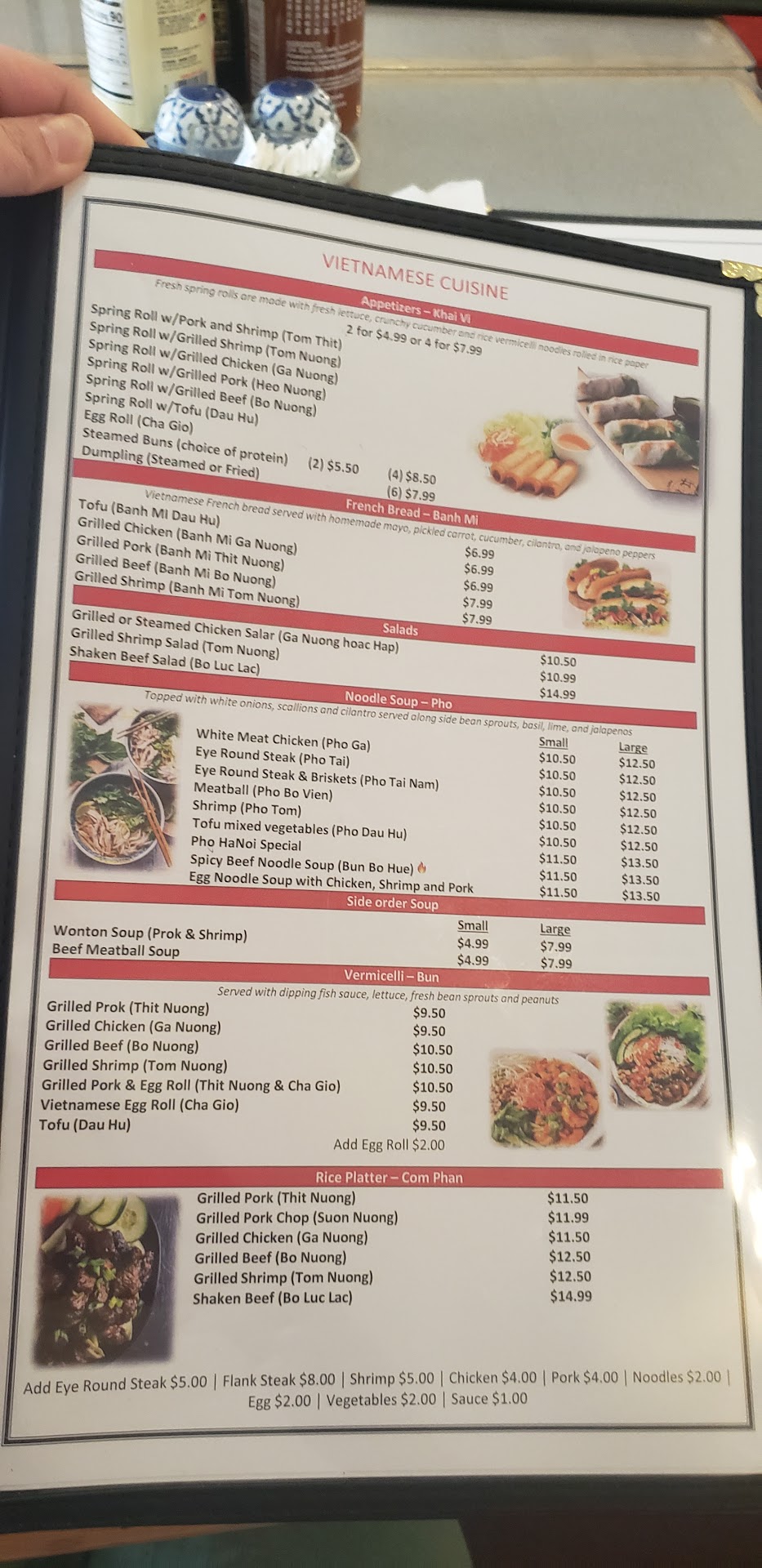 Read moreworst restaurant experience in a long time. Waited over one hour for our food. Server was not friendly towards my husband who is Vietnamese. He wanted to change his soup order and the server rolled her eyes when I told her. Didn’t offer me chopsticks with my pho. Husband ordered pad see ew and it took way too long. Plus the dish was too sweet, it straight up tasted like bbq sauce. and noodles were not cooked well. We were charged an additional $20 for our meal accidentally, my husband gave a tip before they corrected our bill and they didn’t return it with the change. They didn’t apologize for the mistake, didn’t say anything when we walked out the door. Over all we didn’t feel welcome and the food wasn’t even that great. We will not be...