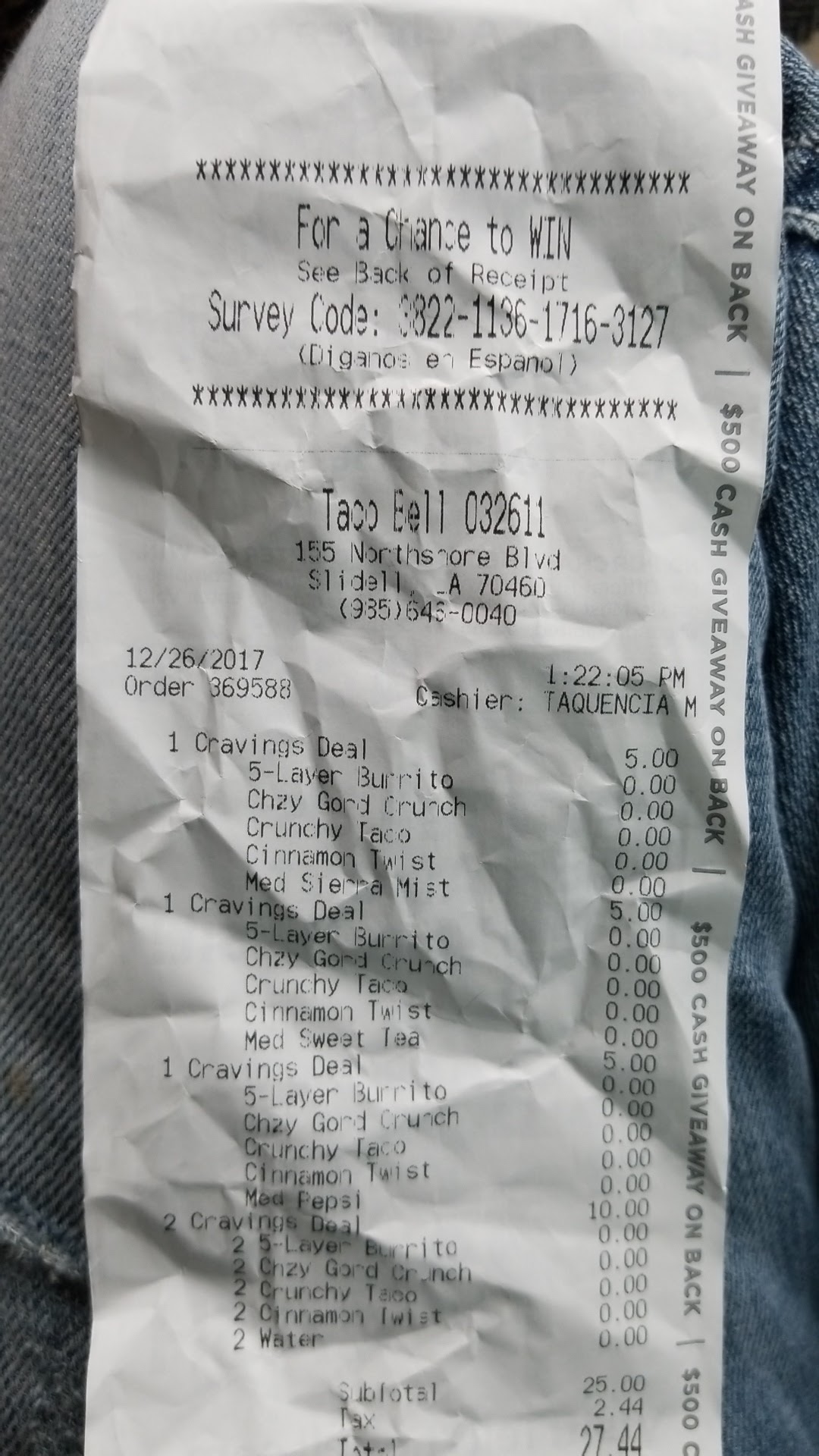 Read moreMy husband went to pick food up through the drive thru and the dude had an attitude to begin with when he ordered. Once he ordered the food the dude didn't even acknowledge him, he had to ask to see if they got his order. They seemed confused and honestly on something when he paid and got the food. We know that most people working here are probably young kids...and that it's a fast food restaurant, but come on! They might not be polite and customer service skills a big 0, but they could have gotten our order correct atleast. They were out of the cheddar chalupas they said, so gave us the regular chalupa boxes, except none of them came with burritos, and they also forgot our twists. I work in a hospital, and my husband just got off of work as well...we just wanted something quick to grab so we can eat with the kiddos and call it a night. When I called the store to complain about the missing items, the dude didnt even listen to me, and started talking over me to someone. When I asked for the manager, he claimed it was him. I then expressed my worries about the order, all he had to say was "okie dokie." This place was convenient to our home, and again...we just wanted something quick so we can rest for the evening...but definitely not coming to this location again. It was upsetting for a kid to talk to me like that, and not even try to be helpful about the order they messed up. It will be a hard pass for us next time, would not recommend. Our cashier was...