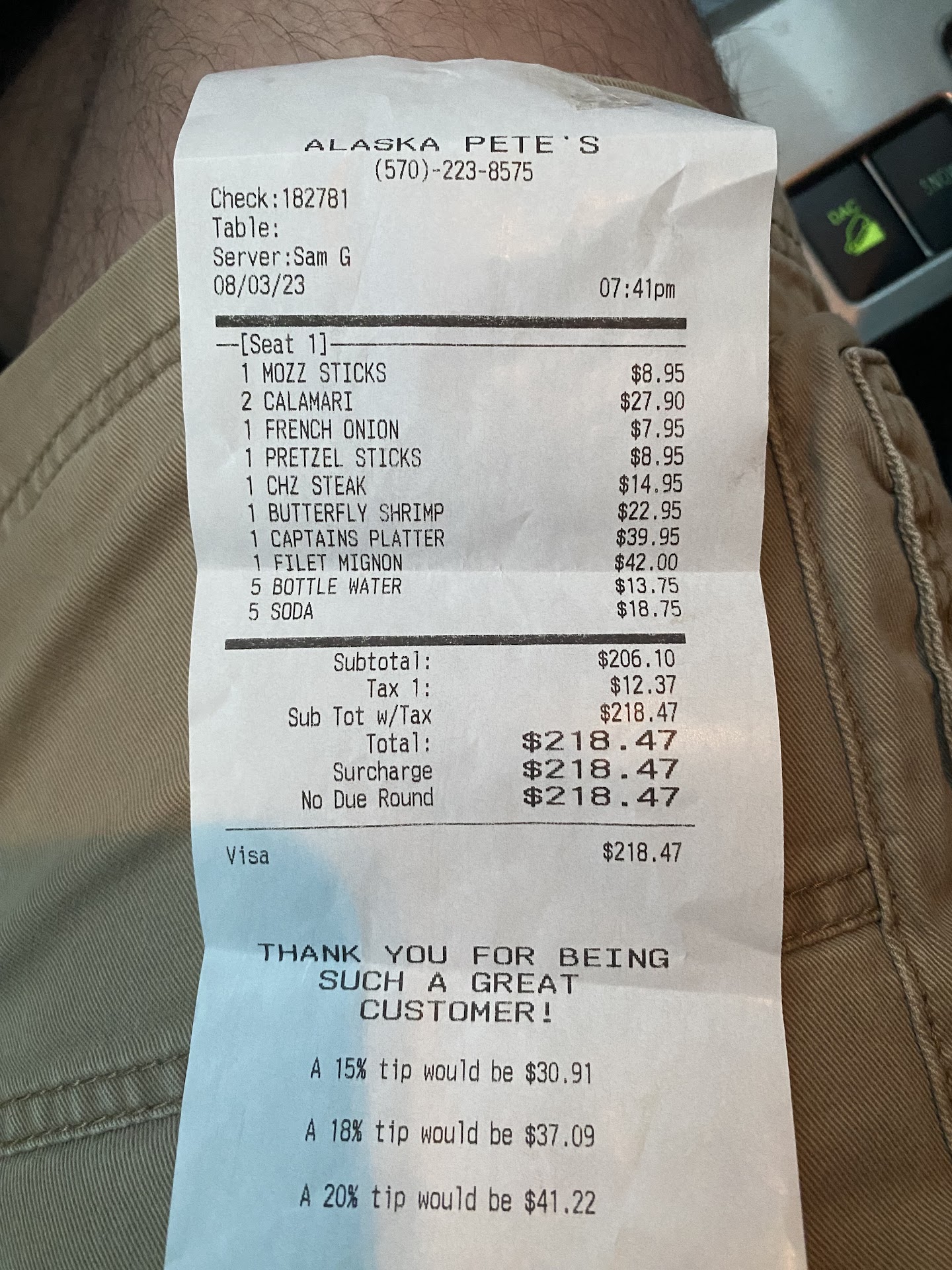 Updated 8/6/23 I understand that everyone has their own preferences, but it is fair to also say that maybe the person cooking had an off day. This will not be a wrestling match. When I used the word "sneaky" I was referring to the fact that the receipt shown was not the original one brought to me when I handed over my cc. The original bill was for $201.XX. This bill for $218. XX is what came back to me for my signature after it was already charged. That is why I wrote a note on the receipt. Thank you...