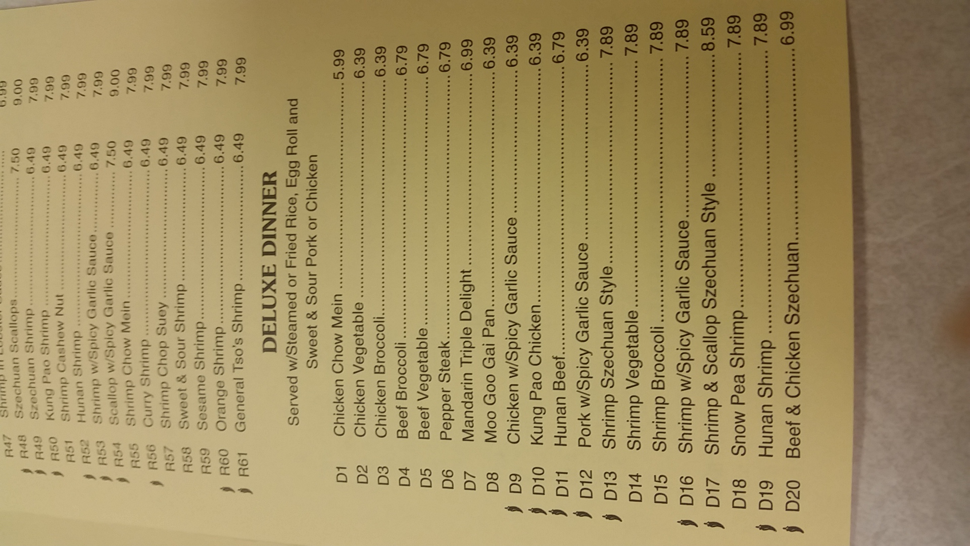 On a hunting vacation with my husband. He ordered 2 large wonton soups and house Mei fun. I ordered a beef and broccoli deluxe dinner with fried rice and sweet and sour chicken. I ordered mine with no broccoli and extra beef and she acted like I had two heads! I always order from other places this way and it's never questioned. Once we got back to the hotel room and opened the food we saw how terrible everything really was! The beef in the Mei fun was GREY! My husband is a butcher and he refused to eat the beef. My meal came with very little meat even though I paid extra for extra beef and only 3 pieces of sweet and sour chicken. The fried rice is literally rice with some kind of brown sauce/seasoning on it and no veggies or anything else. It tasted like it was month old box rice from the store. The wonton soup had a small sliver of some kind of meat in the wonton and the broth was basically water with few pieces of green onion. Overall a...
