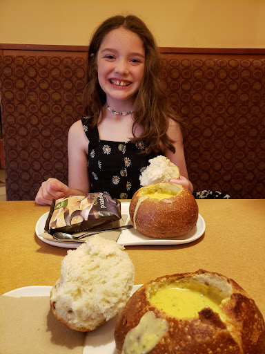 My first experience was the drive thru. My partner ordered his food first and staff member did not ask if there was anything else to be ordered. Immediately instructed us to keep driving. Had to correct her and she took my order. I ordered bread bowl with chicken noodle soup and they did not cut a hole out of the bread. They just gave me a loaf that I needed to dig a hole out of with my fingers.