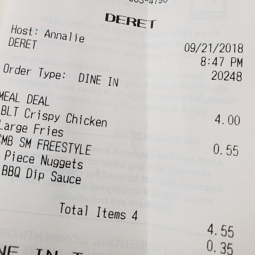 Read moreTypically really liked coming to this location, not sure what has happened. Made my order todat just before 6pm for a burger combo, the girl handed me my drink cup with her index, and middle fingers inside the cup, obviously not going to be drinking from something people have had their fingers in, so no drink with my combo... Got my order, the fries were good, but the burger I ordered had everything but hamburger... looking at it, it looked like a fish paddy.. but it was chicken, so not sure what happened there, so not eating that. The store was at least somewhat clean, but the staff seemed to not really give an effort, they seemed like they all didn't want to even try to be there. I think wendy's has officially...