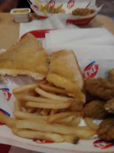 Read moreDrive thru I ordered a 4 piece chicken strip meal, it was around 8pm on a Friday night no other car in line not much inside. I waited at the drive uup window after paying 13 minutes ..... Honked the horn girl opens window and asks be me what, just says'what' . I say how much longer , she says for what. I just stared at her. I was at a loss for words . A car appeared behind me and I said. Ok may I have my food now or my money back. She shuts the window walks away a few moments l as later another girl hands me a bag with something in it and shuts the window. I assume it's my chicken strips drive away get home ope my bag and pull out a burger and onion rings. ...