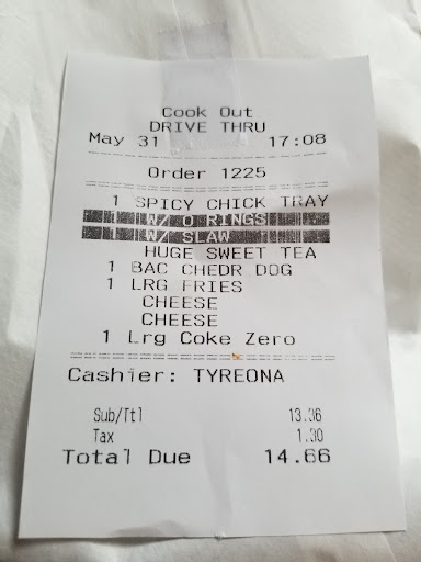 Read moreThe service here is always great. I NEVER like to complain but this experience just bothers me so much. There’s this one guy named Solom who worked the drive thru window on Sunday November 10th at 1:40am!!!! He lead me to experience the absolute worst experience in all for ever going back to Cook Out all over a simple Chicken Quesadilla that was ordered and I never received it in my cookout tray. I’ve never in my life experienced such disrespect over a food item that was never received. This experience was highly embarrassing and the reason why I try to avoid dealing with people at fast food establishments because their customer service skills are the absolute worst. I’ve had the incident where I had onion rings instead of the 2 sides I originally asked for. And the drive thru person never argued with me but this guy was completely just down right rude about a quesadilla I’m so thankful it wasn’t an actual full meal who knows what he would’ve acted like if he’s capable of acting in such way over a quesadilla to me as a guest in...