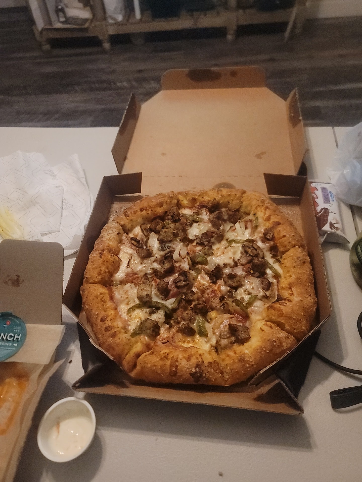 When the pizza was finally cooked, the manager shows me the pizza and I said I didn't order a sausage and black olive pizza, it was meatlovers. Now, look at the photo I attached and tell me it looks exactly like the rubber picture. The cook had the nerve to point to one of the four ham pieces she put on the pizza and said it was "covered under the cheese". I said fine, and the manager shoved the OPEN boxed pizza at me and walked away from the counter.