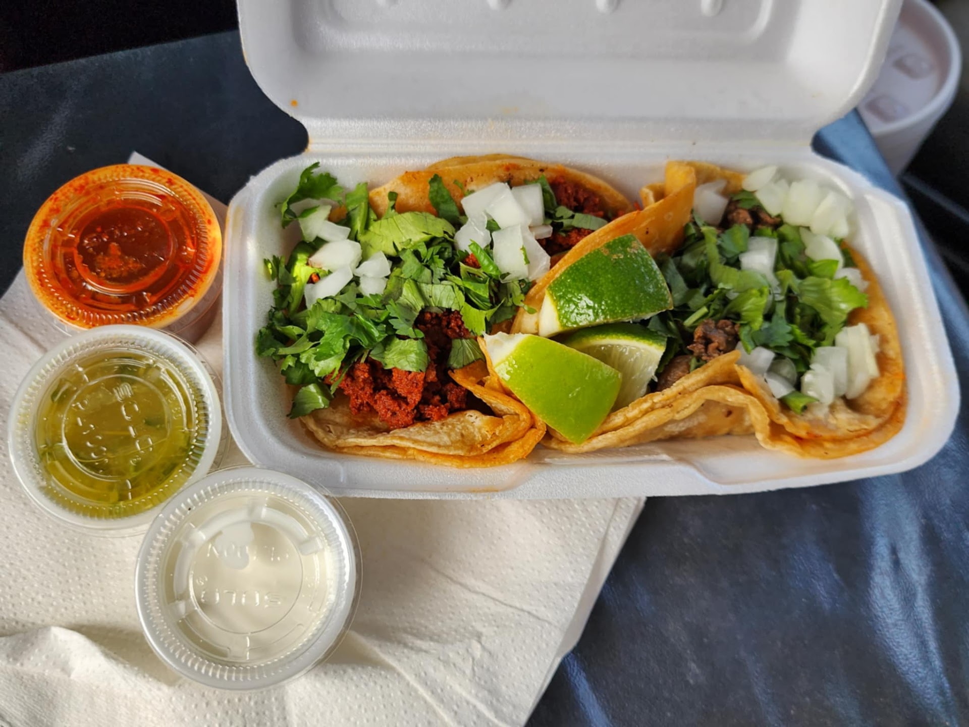 After wanting some authentic tacos, I found this little gem. The reviews are great, so I stopped. It's next to a laundry mat in a small strip and looks run down, but don't be discouraged. I ordered two tacos, one steak, one chorizo. Topped with fresh cilantro and onion. I waited five minutes, maybe. You can see them cook your food. There is a good but of sitting space inside. The people who took my order were super friendly. The tacos were exactly what I was craving. Both chorizo and the steak were tender, with no big chunks. It was seasoned perfectly. I ordered a side of sour cream. The tacos come with a spicy red salsa and a mild green salsa. The mild green salsa was more chunky. The red one was smooth. I prefer spicy, and it did the job. Just enough spice and heat to be noticed, but not overwhelming. I was hoping they had pombazos on the menu, but they didn't. No worries! If you're in the area, stop by. Will...