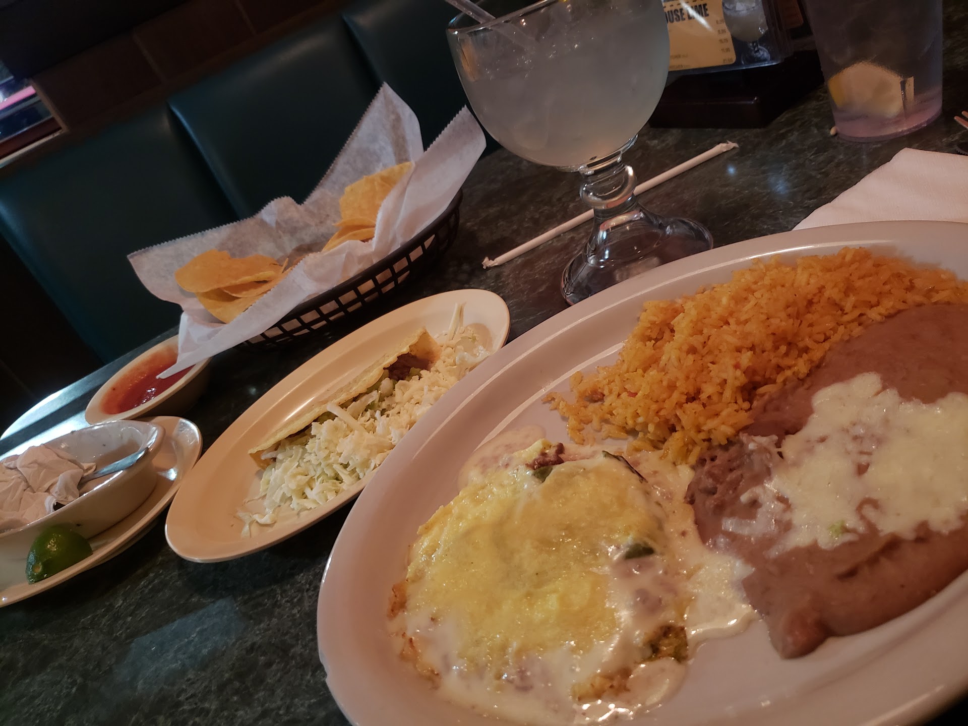 Read moreUpdate. Came here on a Tuesday around 430 pm. Was a normal dinner crowd. I bumped it down to one star because of the plate and the cleanliness. First the condiments had not been wiped down. No alcohol menu. Food came out super quick and inconsistent in temperature. Received the wrong order. Didn’t include two items I ordered and was charged for one, which they fixed but the server should had known I didn’t get half my order. Margarita was ok, typical weak margarita. They came out with a nasty cart to clear the table.