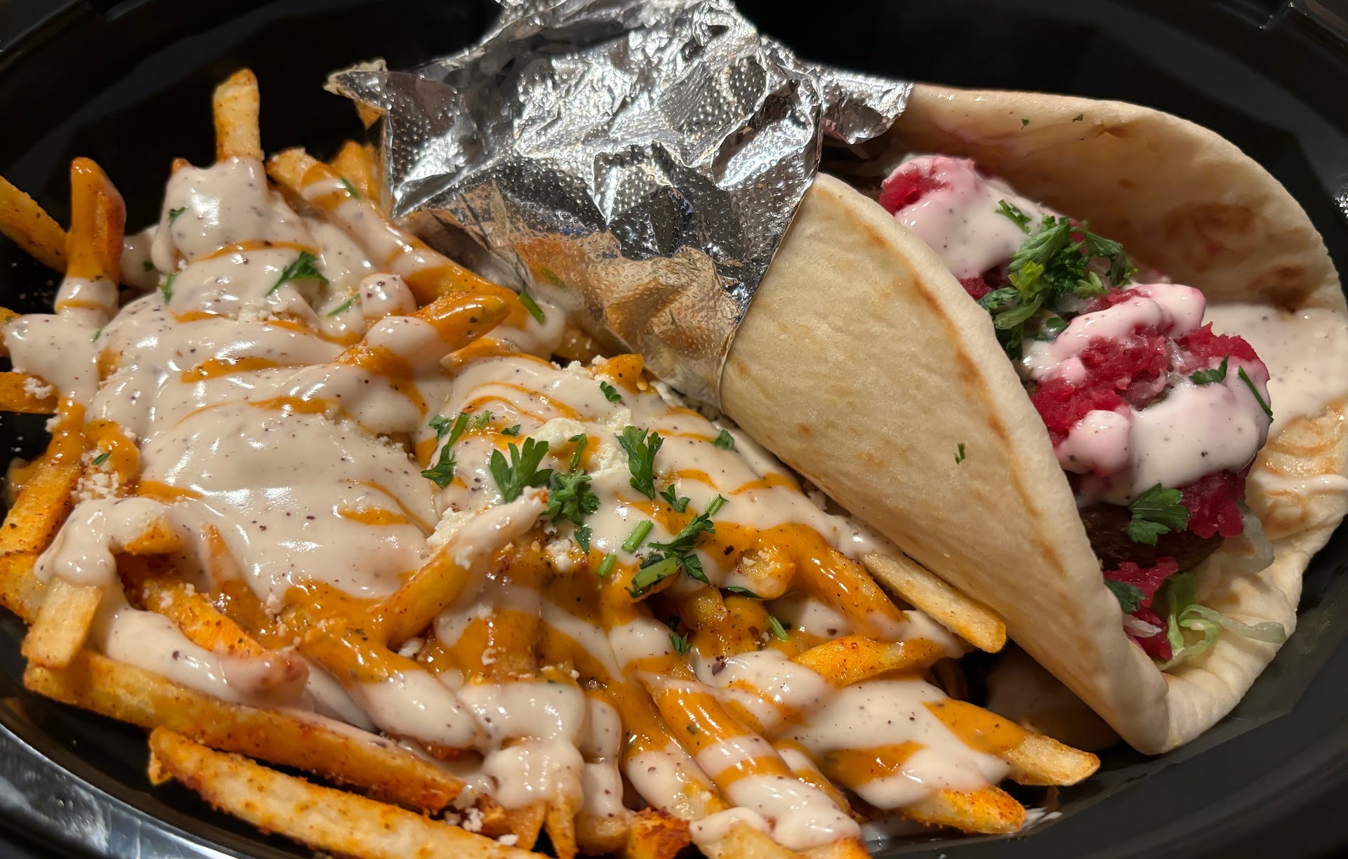 I got the Gyro Platter, it was 70% shredded lettuce and rice. The other 30% was meat, onion, tomato, feta.