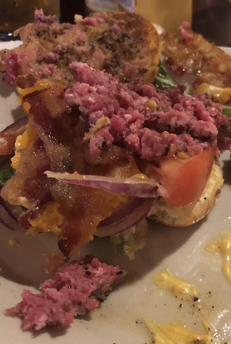 Read moreWant to eat at a smoke-filled dive with sub-par food? Badly lit atmosphere, (one can only guess why)…This is your place! Hostess/Server was pleasant, but that’s the only positive note! Store bought chips and chunky salsa for $4.99? Frozen tater tots, overcooked in the oven? But the kicker???? Look. If you can’t even cook a standard burger, you need to re-think your career choice! Advertised as an 8oz. Angus beef burger with the basics… Ordered mine medium rare, as I love a good burger. This was what I was served! Basically burnt on the outside and RAW on the inside! Never again! And I’m calling some friends in health services to pay a visit to this pit!