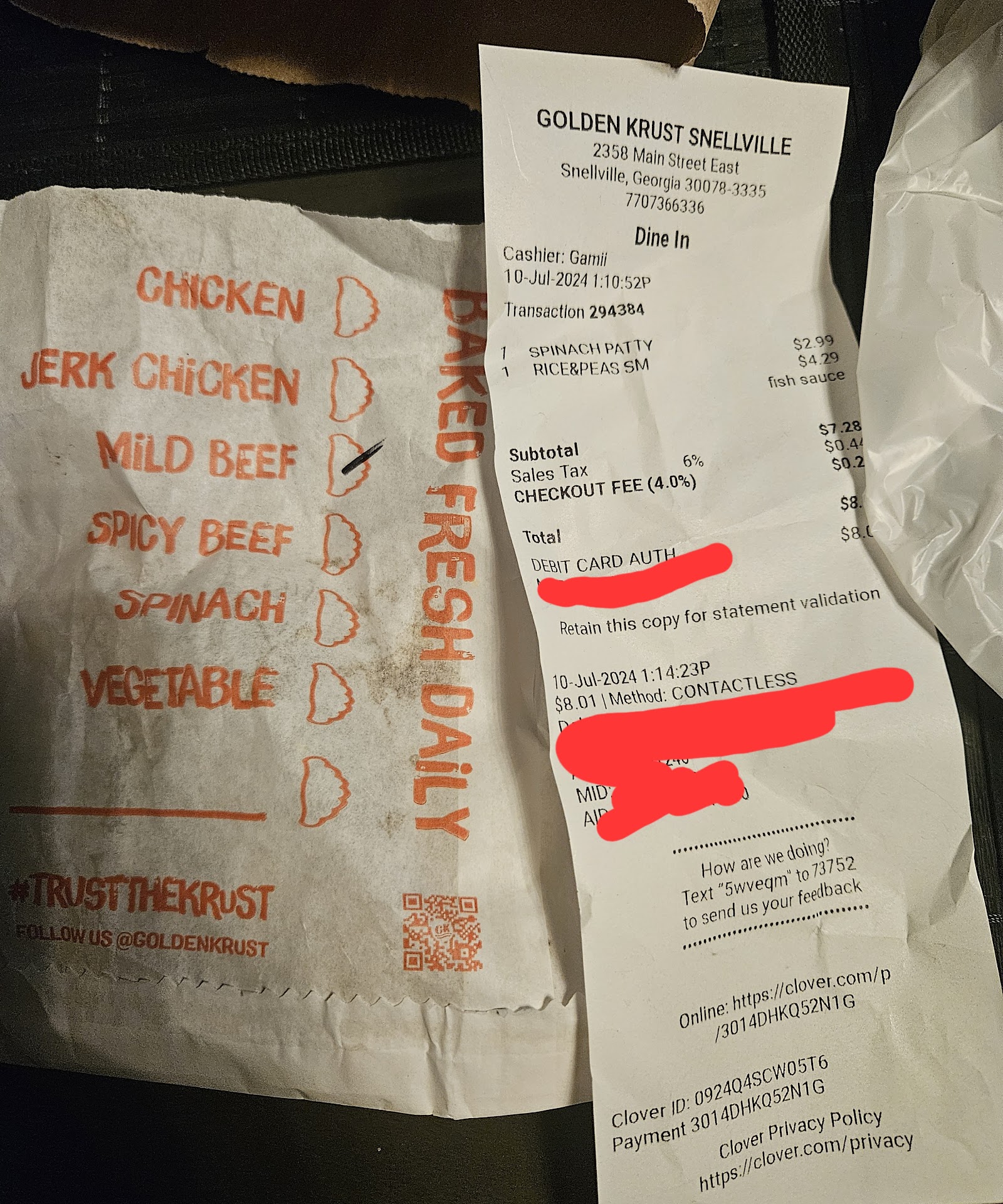 Read more1st time visiting today. I was in route to All Island Cafe on Memorial Dr. in Decatur. I live in Covington, GA. so I do have to travel to get great Island food. I saw Golden Krust as im driving up 78 & thght I will give a try after seeing the long drive thru linesđ Good sign for me. Nice & clean as I entered. Food looked fresh on display no food on counters. I took to the older short lady she was very patient & nice. There was 3 others. The lady working the drive thru definitely looked as if she was tired & having a long day(attitude) I ask her abt the juice she ignored me however the older lady gave a small cup to try it & I ended up buying a Lrg Pineapple Ginger. The more I talk to her the more i purchased. I spent $65 food just for ME! Coco Bread, Veggie Jam Patty. 2 Curry Goat Rice & Peas, (because No Snapper).. w/Cabbage & Plantains. Side of Mac & Cheese which were All so yummy fresh & deelishđ My only issue would be the fact she immediately charged me an Extra 2.40 because she Assume I was paying by card when I had Cash so she adust price. The World is becoming a Cashless Society Don't penalize your Customers! That's Not Right. Luckily All I had was Cash or I would have left that $66...