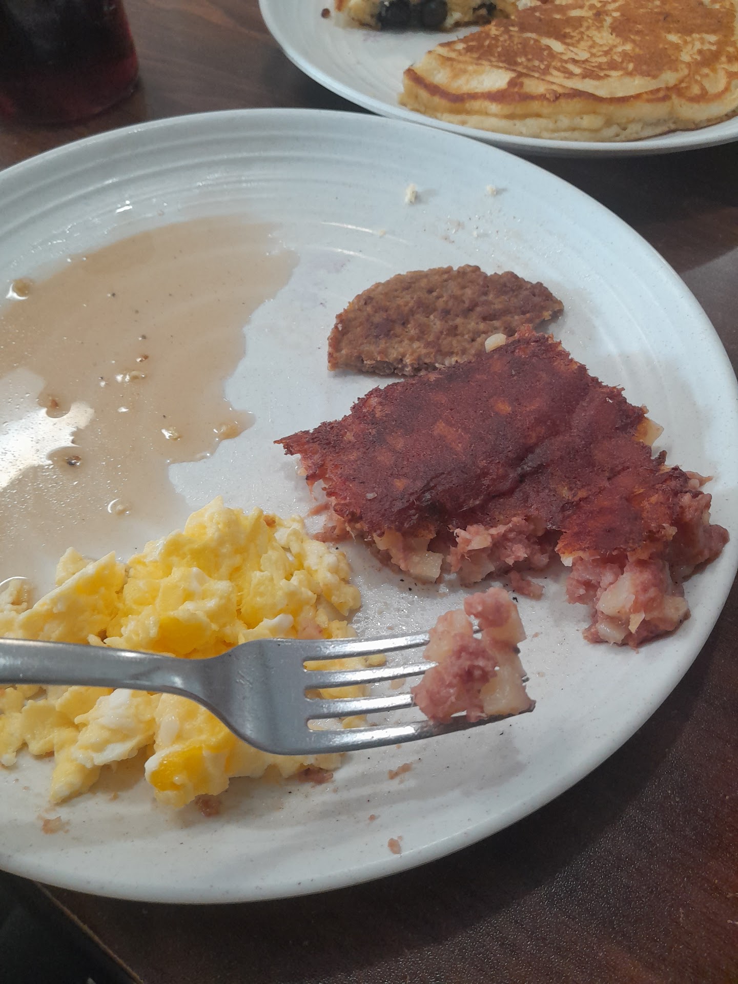 I was sat not to far from the door so a fly did get in and land on one of my pieces of pancake and then on top of the syrup bottle which I asked the server to remove so it can be cleaned but that really does make one lose their appetite rather quickly so I just asked to take what was left to go....