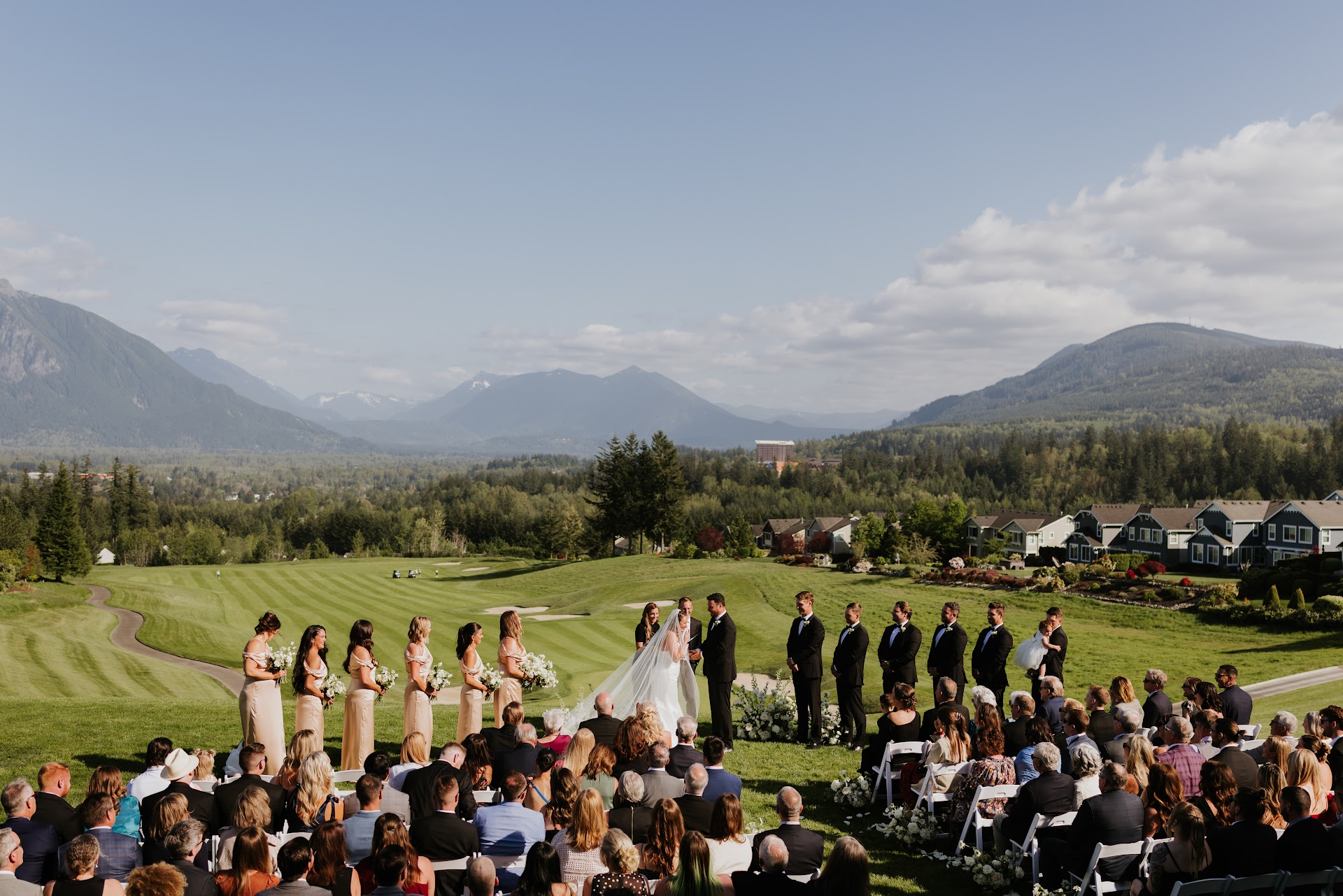 Venue Appearance and Ambiance: The Club at Snoqualmie Ridge is absolutely stunning, with lush greenery from the golf course surrounded by mountains and nearby residential houses. The close proximity of the ceremony and reception areas created a warm and inviting environment where guests could wander without feeling lost.