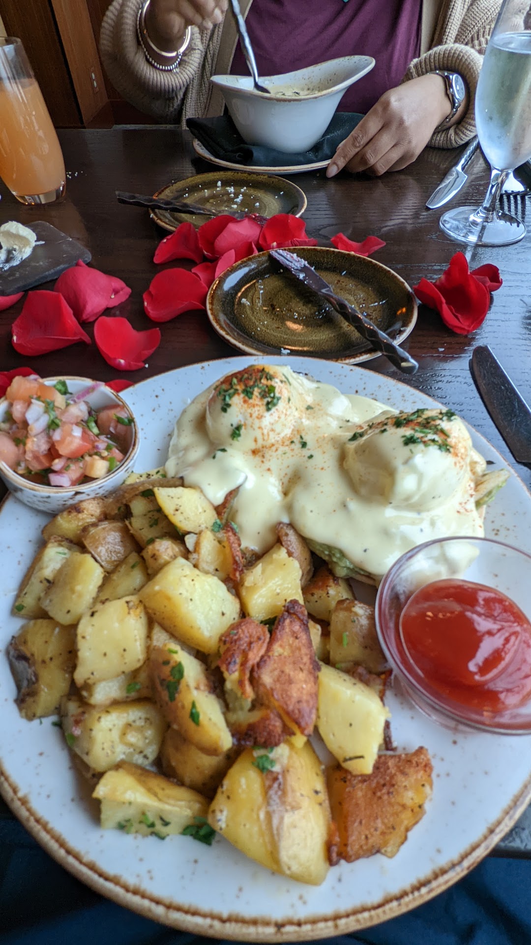 Breakfast; egg Benedict was perfectly cooked - yolk burst at a touch, the hollandaise wasn't broken. The combo of crab and avocado with the pico-de-gello was delightful. The yokun potatoes were crispy on the outside and soft on the inside. The Dungeness Crab omlete was likewise delicious.