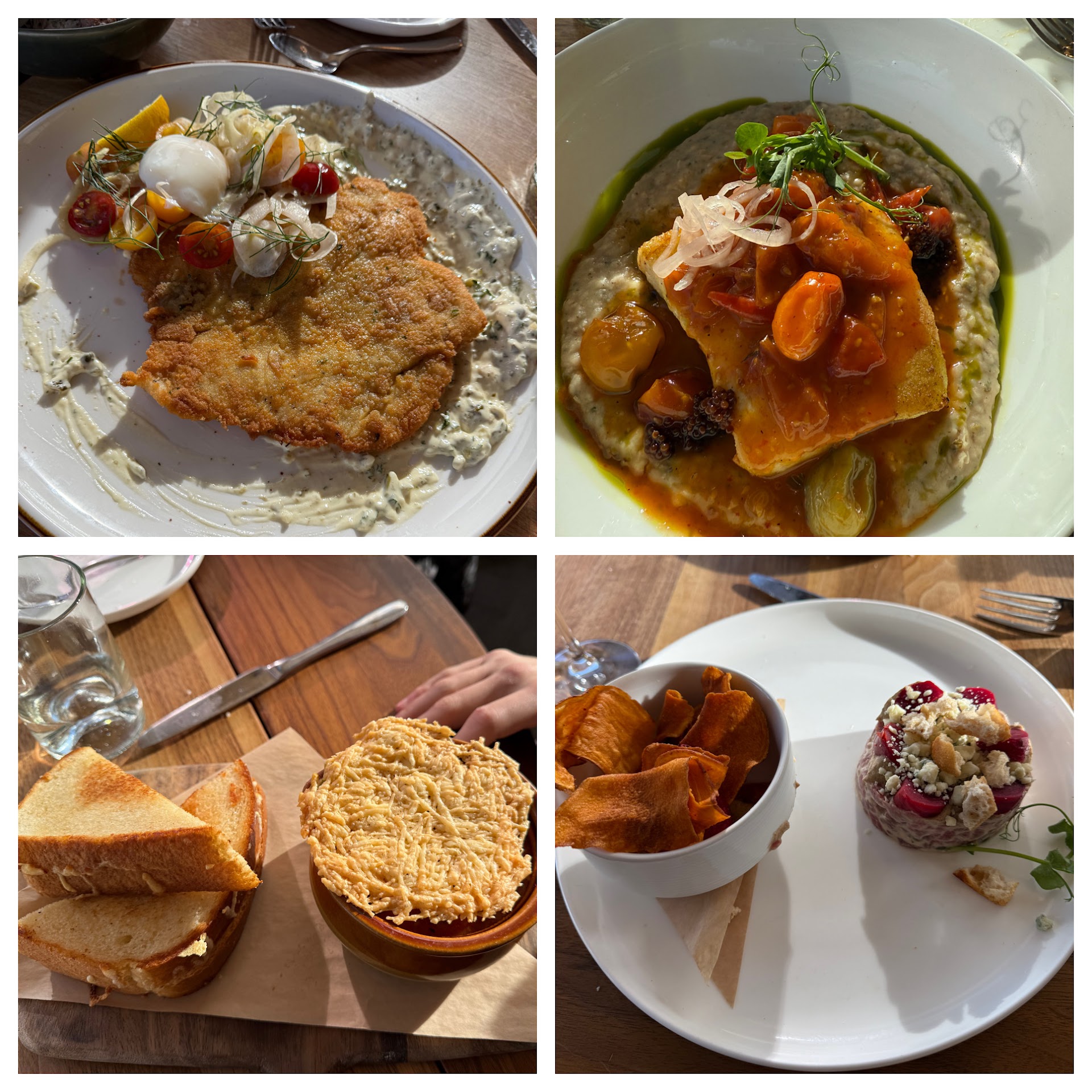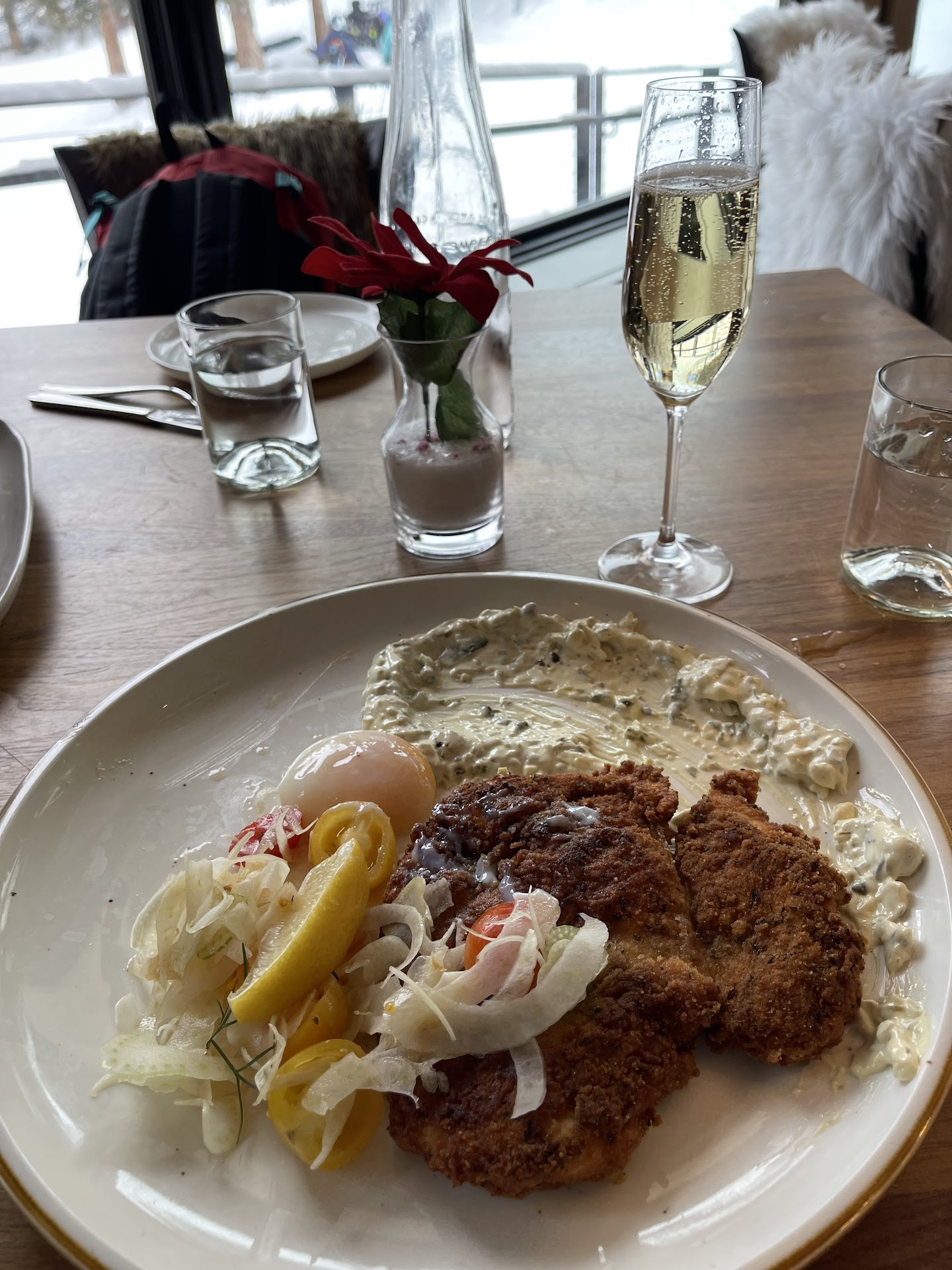 Read moreWe made a reservation ( lunch served only) and received a confirmation text day-of. When we arrived, they had no record of the reservation.We were still seated, at a small table behind a pillar which blocked any view of the mountains. We spoke to a manager who offered to reseat us if we could be out in one hour to accommodate a later reservation. We agreed and he offered us rolls for our table, which we interpreted as a kind gesture for our reservation issue. Not so- we were charged $10 for 4 dinner rolls. I ordered chicken schnitzel and my husband ordered the short ribs. The short ribs were moist and tender and the potatoes were good. Brussels sprouts were missing. My chicken schnitzel was deplorably presented. ( the sauce was totally schmeared across the plate- nothing like the online photo presentation- wish I could post a photo! ) The chicken seemed to have been dipped in a fryer rather than sautéed, and was dry. A disappointing and expensive meal. We would definitely NOT recommend this restaurant- a huge...