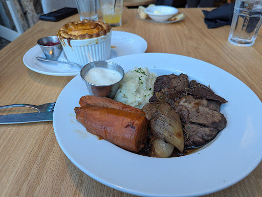 If you're a normal person, who likes really, really good food, and doesn't mind some slightly dated atmosphere, you need to come to this restaurant in Snowmass. My wife and I had the baked brie as a delicious appetizer, served with apples, honey, crackers and crustini bread (maybe more items), it was very delicious. My wife ordered the chicken pot pie, which is their specialty along with a few other pot pies, she loved it and finished it which is unheard of for my wife. I had the pot roast dinner, and let me tell you, I didn't eat lunch and I couldn't finish mine, but it was excellent as well. Everything was fork tender, carrots, an onion, possibly shallot, horseradish sauce and mashed potatoes, so delicious! People were dining from the hotel casual dress and and from outside from other places all dressed up. They have private areas and larger tables areas as well as bar seating and a few high tops. The deck has fireplaces going and what looked like nice tables outside as well. Pictures below. No room for dessert. If you go here, I think that you will have a really great meal. There is a new guy named Cam, he really hustles and aims to please. We must have seen 5 people at our table at various times checking...