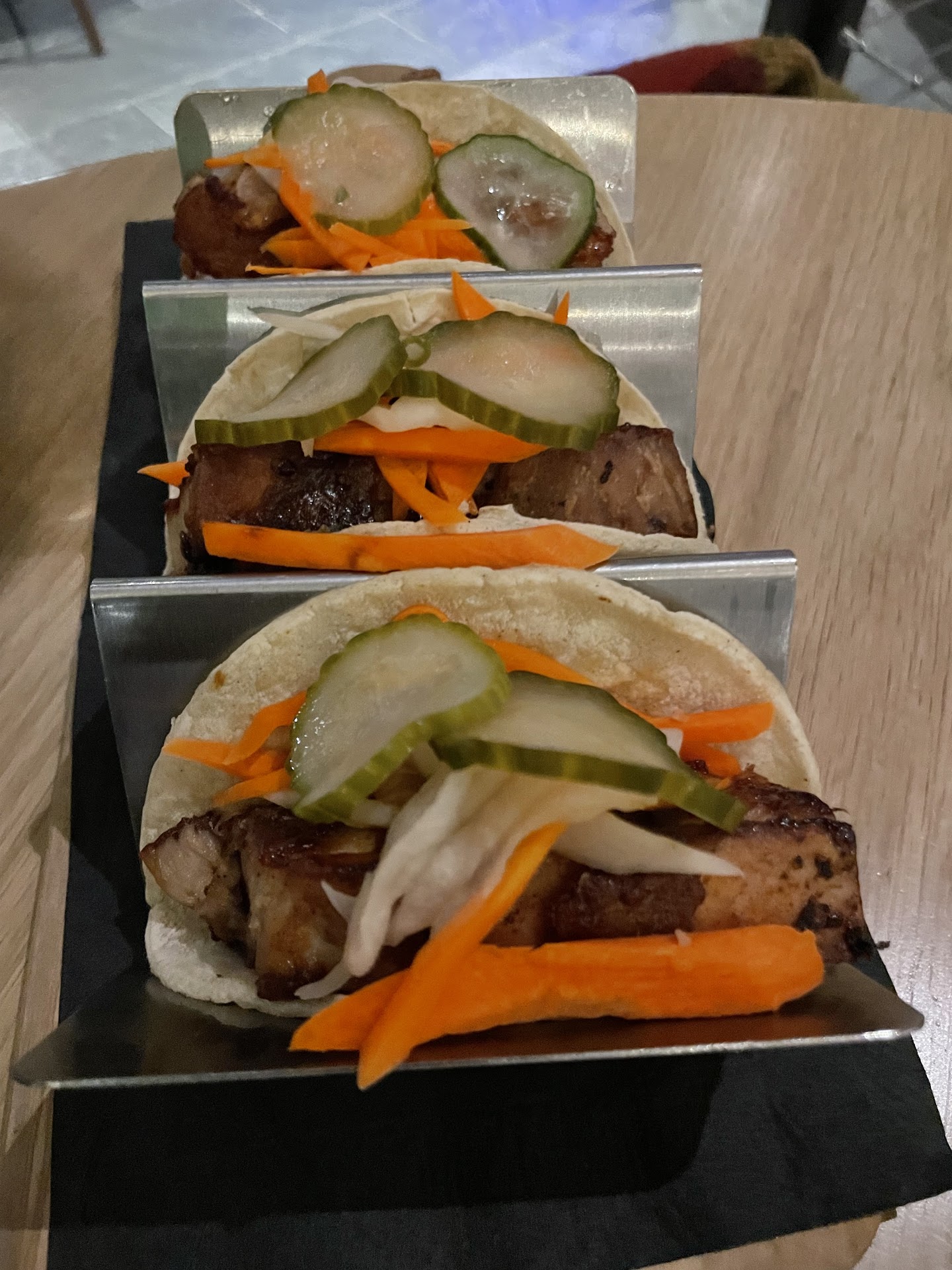 The product~ We ordered tacos on our first visit because we wanted a quick snack before going to dinner. Never in my life have I had tacos this good… and I’ve had A LOT of tacos. The jerk chicken tacos will likely be a number one seller. They are so perfectly seasoned with a generous amount of chicken, a refreshingly zesty mango salsa, and a hidden gem of fried ripe plantain which perfectly balanced sweet and savory. The pork belly tacos were also incredible. They are were perfectly rendered and crisp, simply done with hoisin and a pickled veg + pickle garnish. The pork belly here is now tied in my personal first place with the pork belly bao buns at the Leadmine in Southern Pines, NC. Finally, the duck confit tacos were lovely and flavorful with a good portion of duck, pickled veg, and a cilantro garnish. I would highly recommend this or the pork belly for anyone who has an aversion to spice but still wants flavour. We ordered the coconut flan to go which was a very different approach to flan that I very much appreciated. The flan itself had a beautiful buttery pastry crust (a first in my experience) which made a simple dessert that much more interesting as far as texture. There was also a fruit compote topping (mango if I recall correctly) and it elevated it so much more. 10/10.