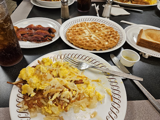 Normally outstanding service at this location. We had a late dinner last night after doing yard and pasture work all day. The server was very distracted, and the only thing correct on our order was my wife's eggs! My wife ordered a cheese and egg plate with scattered hashbrowns, extra crispy, raisin toast, and decaf coffee. I ordered the Allstar Breakfast with hashbrowns (SSC) double, a plain waffle, and the eggs over easy. My wife got my eggs, sunny side up, with a double order of hashbrowns (not extra crispy) and plain toast. I got my wife's scrambled eggs, with plain toast, a single order of plain hashbrowns. Our meals arrived before our drinks. Pointing out the errors to the server, we had to move the items to the correct plates and finally get the server to have the extra crispy hashbrowns made. I ate the eggs sunny side up and the plain double hashbrowns as the server did not seem to understand those errors and attempt to correct them. I assumed it would take an act of God to get the waffle, drink refills, and the extra toast I made with my order. Evetually, the toast showed up after I ate my eggs and still no waffle. As we were preparing to leave, she asked, while taking an order at the tabl we next to us if I was ready for my waffle. We stayed a little longer to get the waffle. Another server checked us out and gave wonderful service, and adjusted off the missing items. She also advised us that the ticket was calculated too high and corrected the overcharge! We will return to our WH, but we will not be served by that...