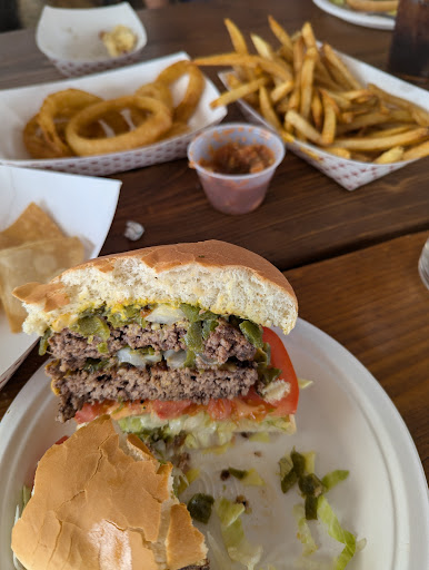 The Mule tried on 9/20/2024 This is a very big burger. It was between 4-1/2 and 5 inches tall. The patties, as always, were fresh, moist, and delicious. The burger was juicy, but the bun held up. The patty looked as though it had a decent fat content, as the grain was fairly open. The American cheese was melted very well, and the green chile was medium heat and tasty. Toppings included lettuce, tomato, pickle, diced white onion, and mustard. Unfortunately, the toppings were on the bottom, which makes everything slide off. I removed the tomato slices and had no more problems. The fries, as before, were hand cut and cooked properly: a light golden brown with a soft center. They were very good, and plentiful as well.
