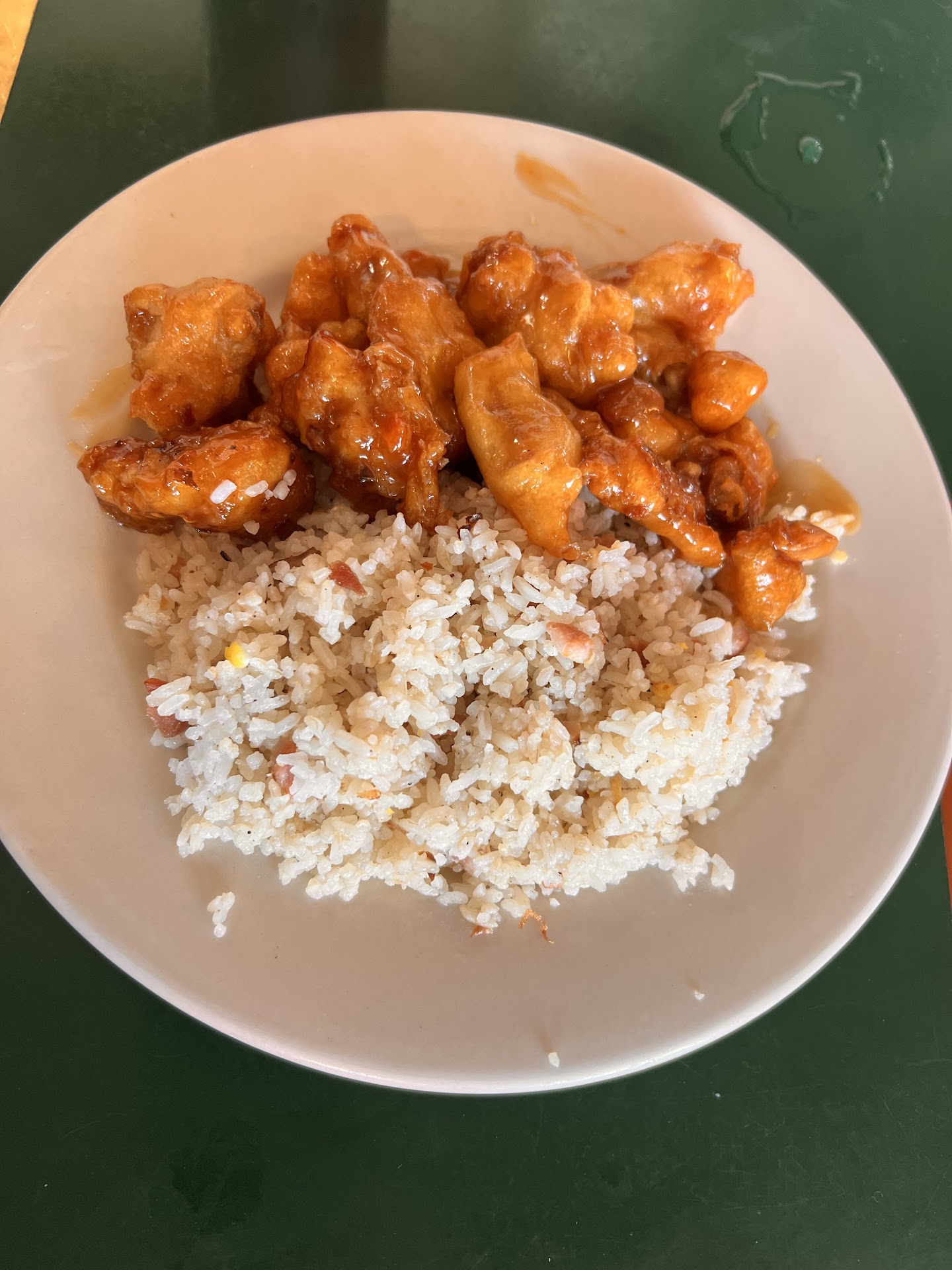 On a Wednesday, I entered as the lone customer, about half an hour after opening. Someone (from the kitchen) finally acknowledged my presence after 10 minutes of silence and led me to a table. Then, an actual server showed and took my order, which was for the lunch special "General Tso's chicken with fried rice" and a small cup of egg drop soup.