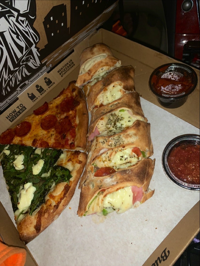 Read moreI can't believe all the years I've been stopping in the shopping center and I have never stopped in here before. IT IS AMAZING! THE GARLIC KNOTS WERE SO WARM AND SOFT AND BUTTERY AND NOT AT ALL OVERLY GARLIC. I should have picked Crime Scene for my slice of pizza I saw the guys in there making a large one for some lucky people and it really looked good. The dollops of red sauce made me envious. Next time..next time. I ordered the Canadian bacon an pineapple. Im glad I did beacuse I gave up pork. It had just the right amount of everything...every bite had some of each ingredient and thats what you want in a pizza...no lack of pineapple. Friendly pizza people inside so I will definitely be back. They have about 10 pizzas to choose from that are ready sliced and then you can also order large ones! The desserts are worth coming back for too...even just for dessert. Easy to find in...