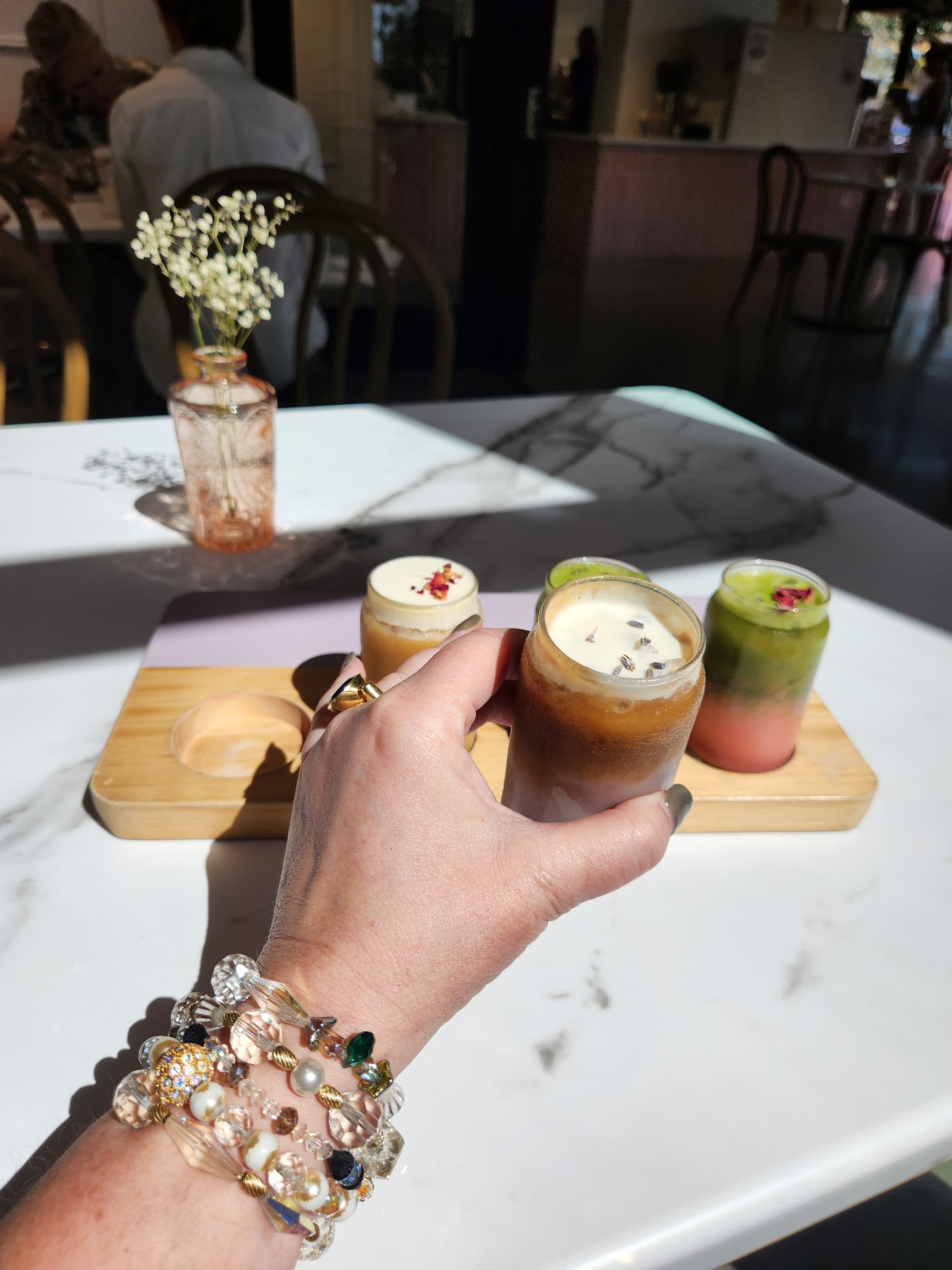 The flight of drinks were good. In the photos, pictured left to right, rose matcha, matcha, rose latte and lavender latte. Rose matcha was a fave, followed by rose latte, lavender matcha and lavender latte. Pricey, but over all, lovely presentation and way to try a variety and choose a favorite. I will likely splurge and get a rose matcha to go.