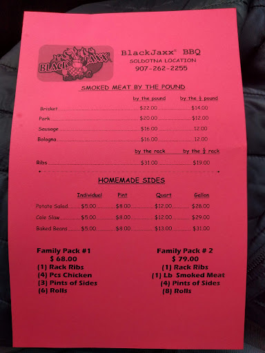 What a treat in Soldotna! We tried going one night for dinner, turns out they were already sold out. We went when they opened for lunch the next day and realized why they were sold out. Super good. Two of us got the three meat plate and couldn’t finish it. And we’re eaters. I went back the next day for the Black Jaxx Snack, which is a 16oz container of homemade black beans, brisket or pork (I chose brisket) and a Hawaiian roll, all for $11. They are also super fast in processing orders. It’s a must visit in the area or driving through to Homer, pending they...
