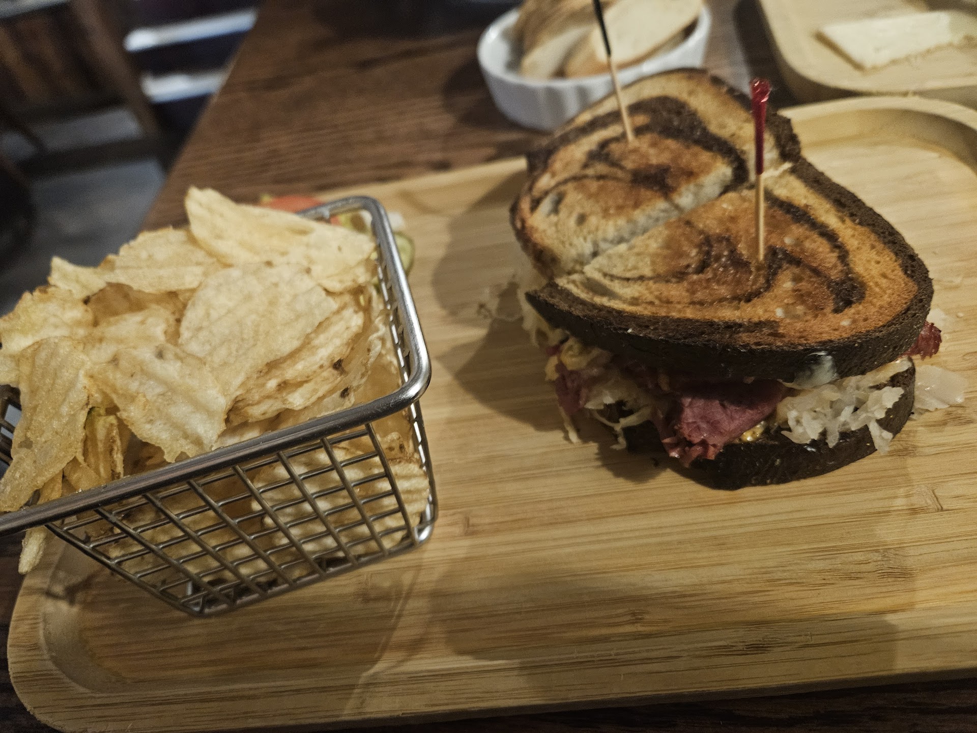 My wife had the turkey sandwich. It's real thick, carved turkey breast. The pickled slaw on a brioche roll was the perfect base. I had the short rib sandwich... delicious, tender chunks of beef. And as a pleasant change from most places, you get crisp, fresh, home-made chips, no greasy fries here. Both plates also had a few slices of tomato, some fresh greens and pickles.