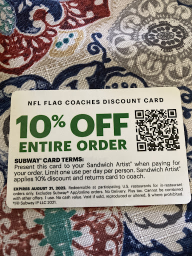 Read moreCame in today with my sons to our has some sandwiches, when it came to check out I presented this card and the employee said he was having issues. He called what I believe to be a manager named Luis who said it was 10% off one item only. I told him I may be mistaken so I re read it and when I brought it up he said I was wrong. I asked him if I was reading it wrong but he kept saying it was just on one item. Out of respect for the other people waiting I just paid. Additionally in my frustration they either forgot or I forgot to get my sons Apple sauce. Wonât be going...