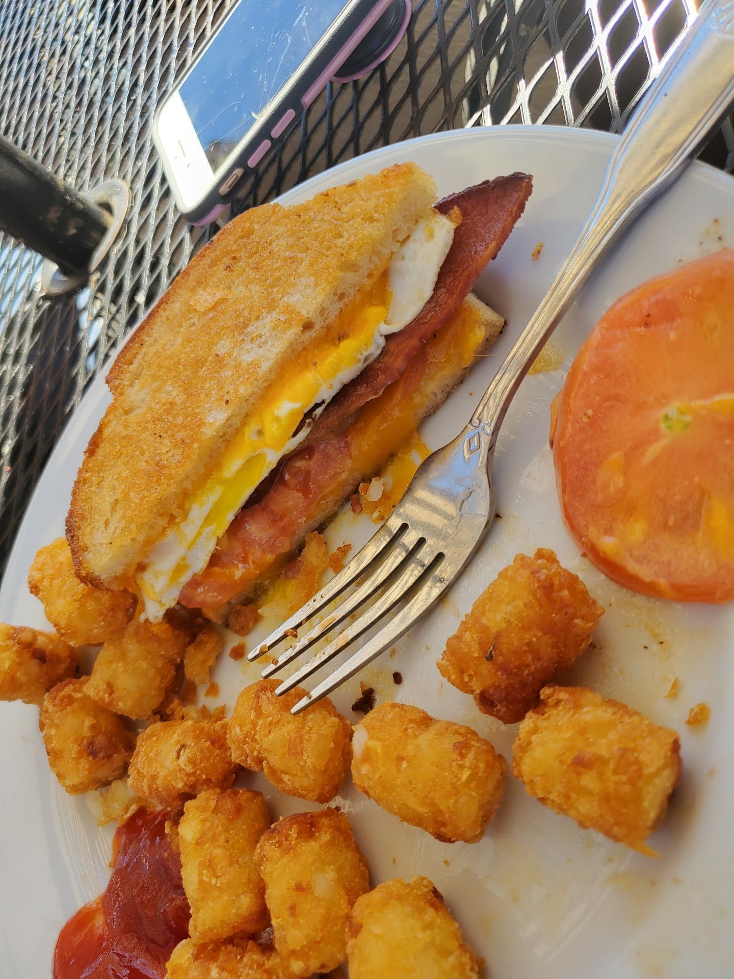Read moreThere was a long line when we arrived around noon on a Sunday but it moved pretty fast. There’s no table side wait service; you order from the counter at the door and then they bring your order to the table. The person manning the computer was fast and efficient—even though there were 6 of us. He also split the items on the check so we could pay as parties of two, which was very nice. The food is basic breakfast fare, nothing special. There wasn’t even parsley or chives to garnish the food. I ordered the salmon Benedict and the English muffin was totally mushy—not toasted enough, if at all. The hollandaise sauce was very good though and not broken. My husband ordered the hot and spicy omelet which he like but it was a little dry. Everything was served with crispy tater tots that were delicious.