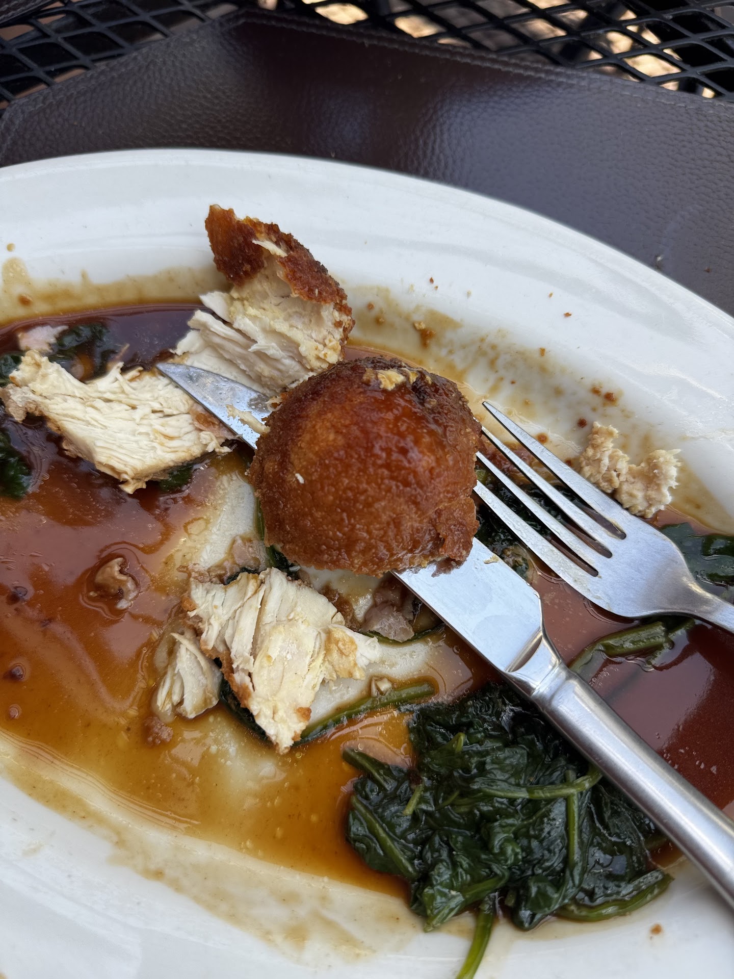 I opted for the biscuits and gravy, a dish that impressed with its puffed pastry, offering a wonderful texture that remained consistent throughout the meal - a rare feat for such dishes. The biscuit's ability to retain its perfect form without becoming soggy was particularly noteworthy.