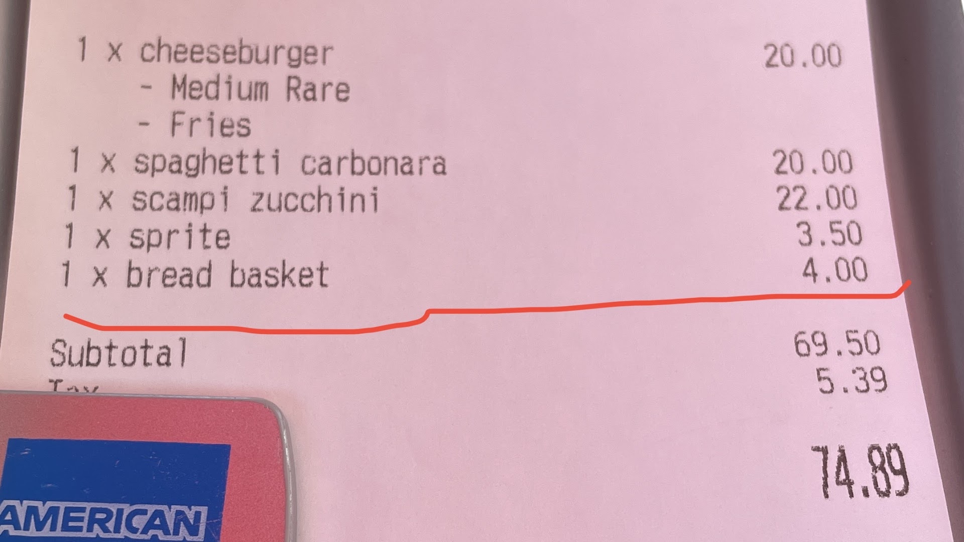 AGAIN, extra bread costs 4 Dollars. 4. Dollars. In California.