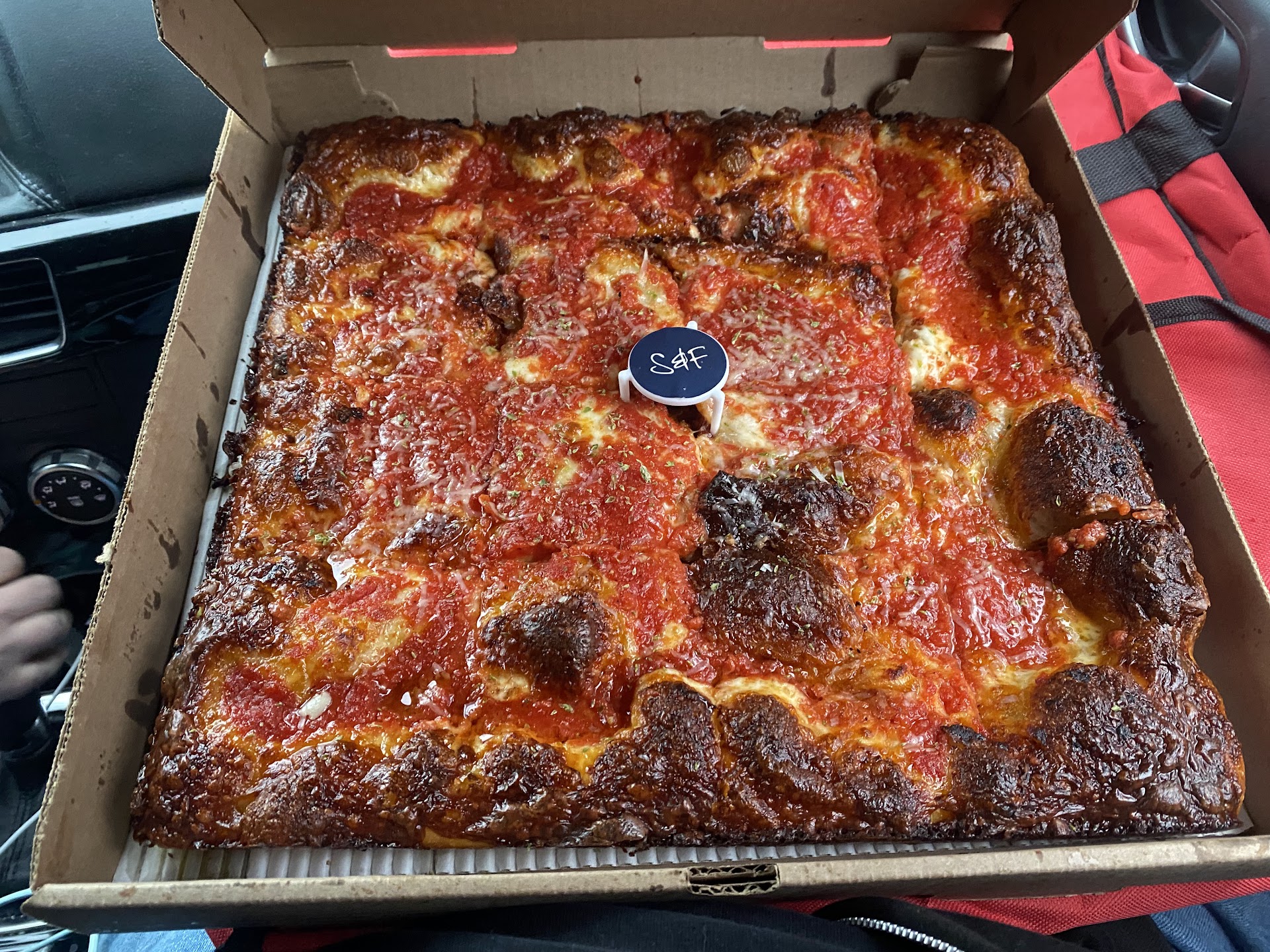 So, our friend has been screaming at me for months to try this joint in Somers Point out. He has been patronizing this guy since he was underground and cooking out of his own kitchen....My girlfriend's family has a shore house in Ocean City, but we're not down there that often. . Well, we were down there last weekend and were able to score a pie reservation for Friday around 6:30pm. You see, you can't just call and order it, you have to reserve your pie and date/time to pick it up. Apparently the reservations go fast (or maybe its the reservations at dinner time), but if you're lucky (like we were) and jumped online right when they "opened" up the reservations for the week, you're good. . They only have 4 types of square pies and one special one (the black truffle one at the time). At our time of ordering, they had regular cheese (about $30 w/tax), a black truffle pie (about $43 bucks w/tax), a vodka sauce pie (about $32 w/tax) a pepperoni pie (about $35 w/tax) and a vodka sauce pie (about $36 w/tax). . The prices on the website will tell you for the plain pie we ordered is $28.50 plus $1.79 tax for $30.29 total. So, it's a few dollars more than a Mack and Manco pie for what they charge on the boardwalk (I think they are like $26 bucks now for a pie). So it is what it is. Difference in ordering is....Well, Manco you can call and get a pie. S&F is a thing....Good thing? Bad thing? Who knows. We were driving from Marlton down to Ocean City (about 45min-1hr) ride, and the stress of getting there on time, with rain and bad weather, idiot drivers, etc...was stressing us out. Was it worth the stress? I guess so. We enjoyed it. . Would we pontificate it the way our buddy did? No. It was similar to Brooklyn Square in Jackson NJ (same distance to us). Was it worth the stress? I guess, maybe? We didn't hate it. We give the guy respect keeping it just like him and a helper. Small batch type of pie. . Everything tasted fresh and delicious. We thought the pie was a little "dark" and crispy for us (we won't say overcooked), and we wish there was a bit more cheese, but the sauce was delicious, the dough was crispy, yet light and airy. . If you're looking for something new down by the shore and don't want to deal with the old standards down there, then by all means, try to score a pie and see for yourself! I would've loved to try a pepperoni or a vodka pepperoni, but im the only one that likes that in the family and I'm not spending that just for me.... . We're glad we tried it and glad we tried a new joint. . There is no parking lot, street parking is touch because it's right across the street from Charlies Bar. The girlfriend ran in and got it, said it was cute inside and they did have. a few tables to sit and eat...