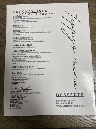 Ladies, thank you for a wonderful dining experience, and answering all of our questions. It was our first visit, first of many to follow. Your food is so delicious. I had a burger that was so juicy with so much meat. Not your typical skimpy thin patty. My hubby had the meatloaf special. He compares everyone's meatloaf to mine, and he said that Tippy's runs a VERY close second. Smart hubby.😁 The mac & cheese, mashed potatoes, and fries were really good, as well. The cakes look amazing. You can tell they are made from scratch. I can't wait to try the slice of Red Velvet cake I brought home. Extremely clean and...