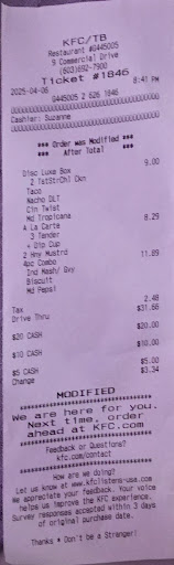 Read moreWas at the somersworth nh KFC to get my Dad who is in the hospital and can have his chicken and potatoes with no gravy that he loves and it was a disgrace. The potatoes have corn in them and top of potoes where hard like old! The chicken was dry legs split that he couldn't even eat it. He said look at this i cant eat this which he has never said always loved his chicken and was so looking forward to it.when i looked i couldnt believe it.They even new when I ordered it was for my dad in the hospital! So brought it back had to wait forever for the one in charge to do refund and says sorry have a great night! REALLY!!! The place was busy earlier so NO excuse for that horrible old food! The place was a total mess and dirty! I always went to Rochester KFC but figured somerdworth due to closer to hospital and it would be hot for my Dad! NEVER again! Good luck with somerseworth kFC people pray you don't get sick and by the way couldn't post unless I clicked on a star they should have a minus on stars cause they don't...