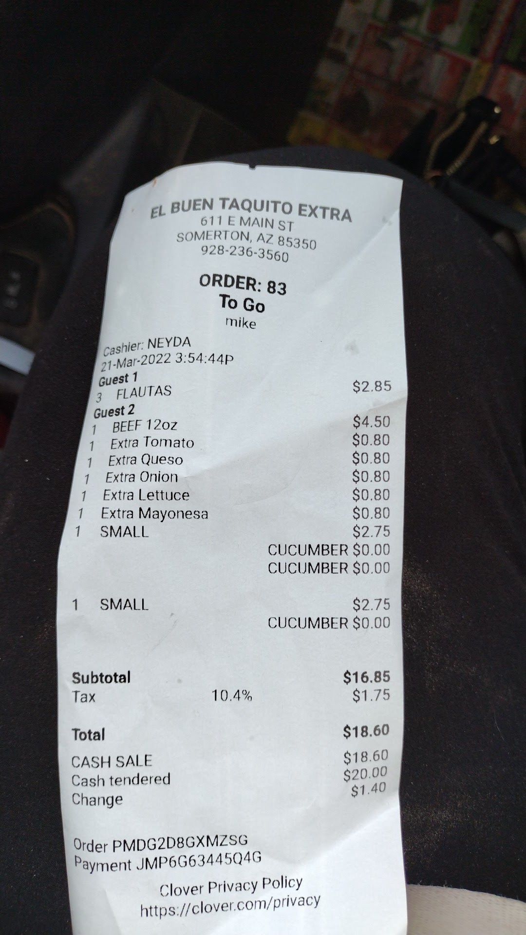 Read moreFood was great. Menu items there weren't too many to choose from. Got classic Mexican items like potatoe tacos which was ordered and a shredded meat bowl with beans you could add the fixings for 80 cents each which isn't too much but believe me they add up quick and didn't know there was a charge for everyone. Added was tomatoes, queso, onion, lettuce, mayonesa. They also have a variety of aqua frescas great selection cucumber was fantastic...