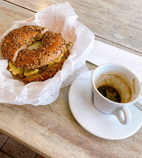 Ordered a dbl espresso and an egg sandwich (2 eggs w/ additions of sausage, onions, red peppers and cheddar cheese) from the gentleman at the counter and sat down at an open spot. Coffee & food came lightning fast and hot. Strong, good espresso paired with a delicious everything bagel filled w/ fresh pipping hot ingredients; what’s not to love?