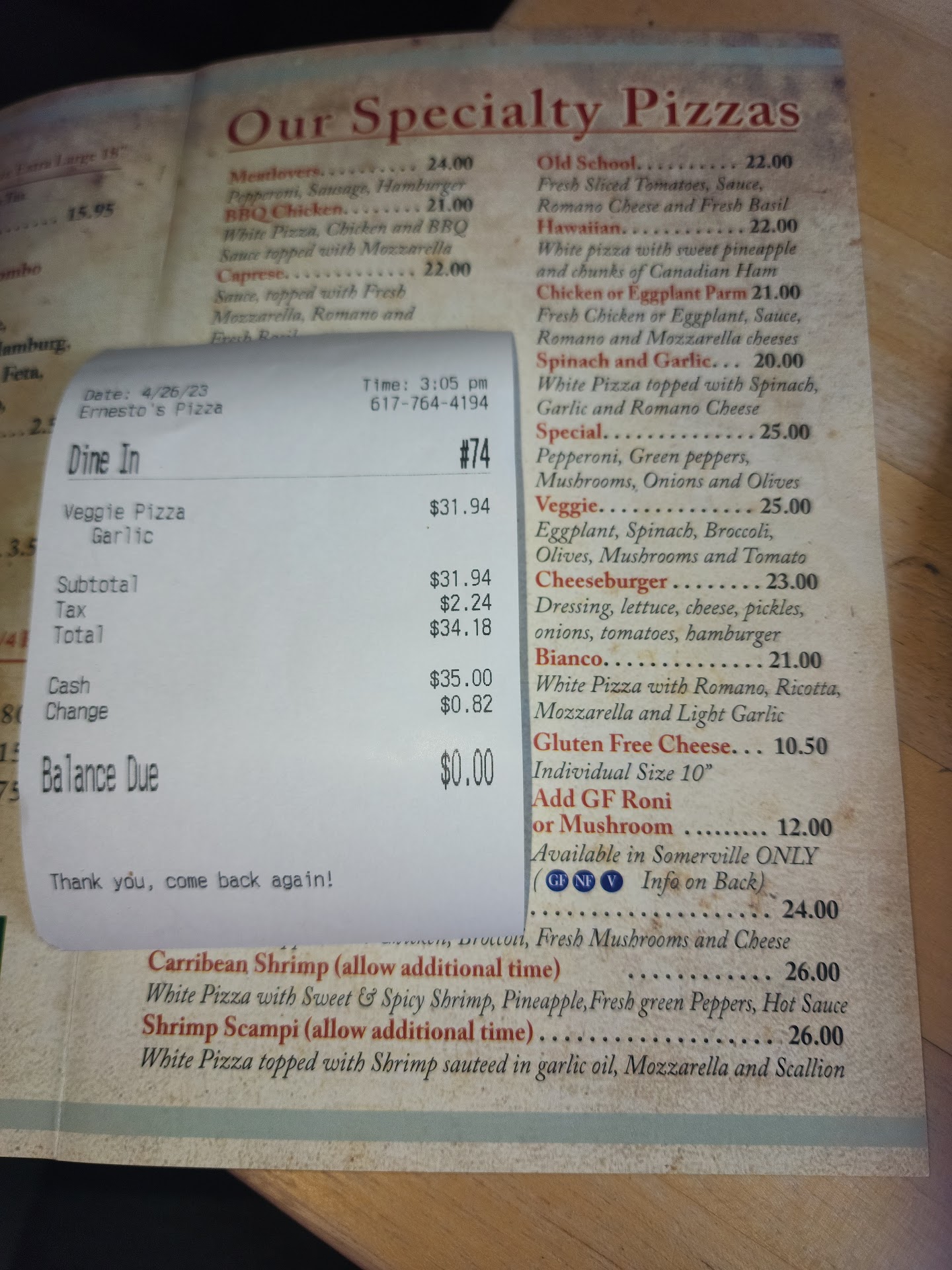 Pizza was delivered very quickly, and was very nicely cooked. Good amount of cheese without being over-cheesed. Nice browning spots from a hot bake, on both the underside of the dough and the top of the cheese. The pizza box was delivered with an anti-tamper sticker, which I appreciate. The dough that Ernesto’s uses needs a touch more salt but I think that’s just a function of their recipe and no knock on the pizza we received. I think if they tweaked that a little bit it would be closer to the kind of pie I would keep coming back to. But for a huge pie that’s only $28 or so delivered (including tip) that’s a great deal. Similar to a Joe’s pizza (Harvard square) in terms of size and quality of...