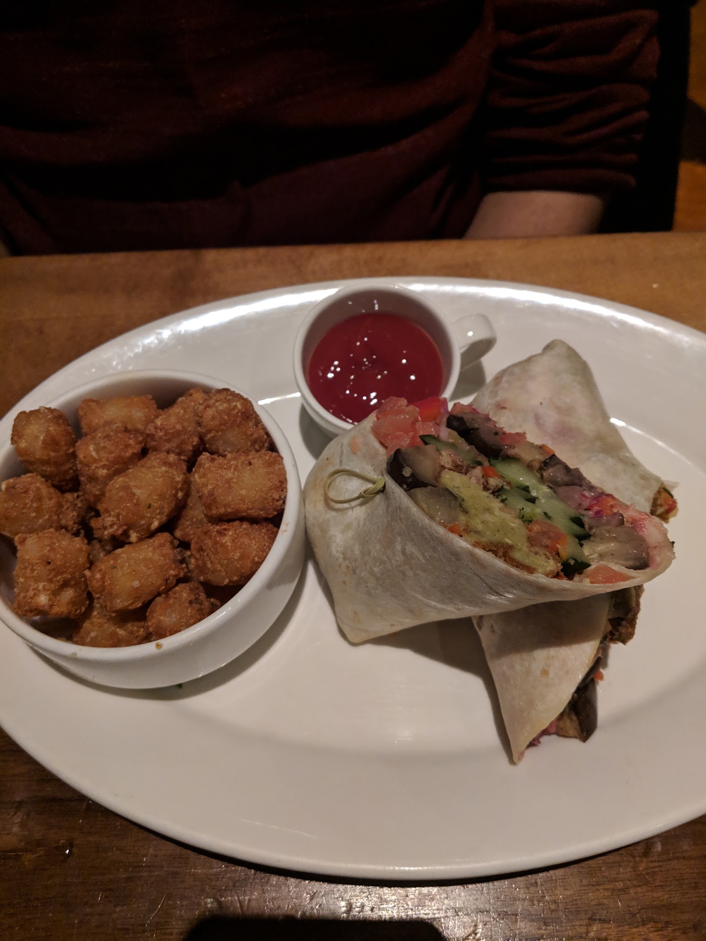 The bad: we got 4 appetizers because none of the entrees stuck out as being worth the $15-$20 tags. E.g., Mac and cheese (i.e., the world's cheapest meal) was like $14 and when we saw am adjacent table get it, it looked runny and not very good. Our apps as follows: Chicken fingers - breading was as crunchy as the vein, that they left running down the centre of the butterflied tenderloin, was chewy. Cornbread was dry on the outside and so wet I could taste the flour mix in the middle. Pappas fritas(translated: fried potatoes) were in fact roasted potatoes with no flavor, and the chipotle mayo was weirdly lumpy. Loaded tots were the best part of the group. But who can really mess up tater tots, cheese, pico de gallo(which was actually just diced tomatoes with herbs) and jalapenos?