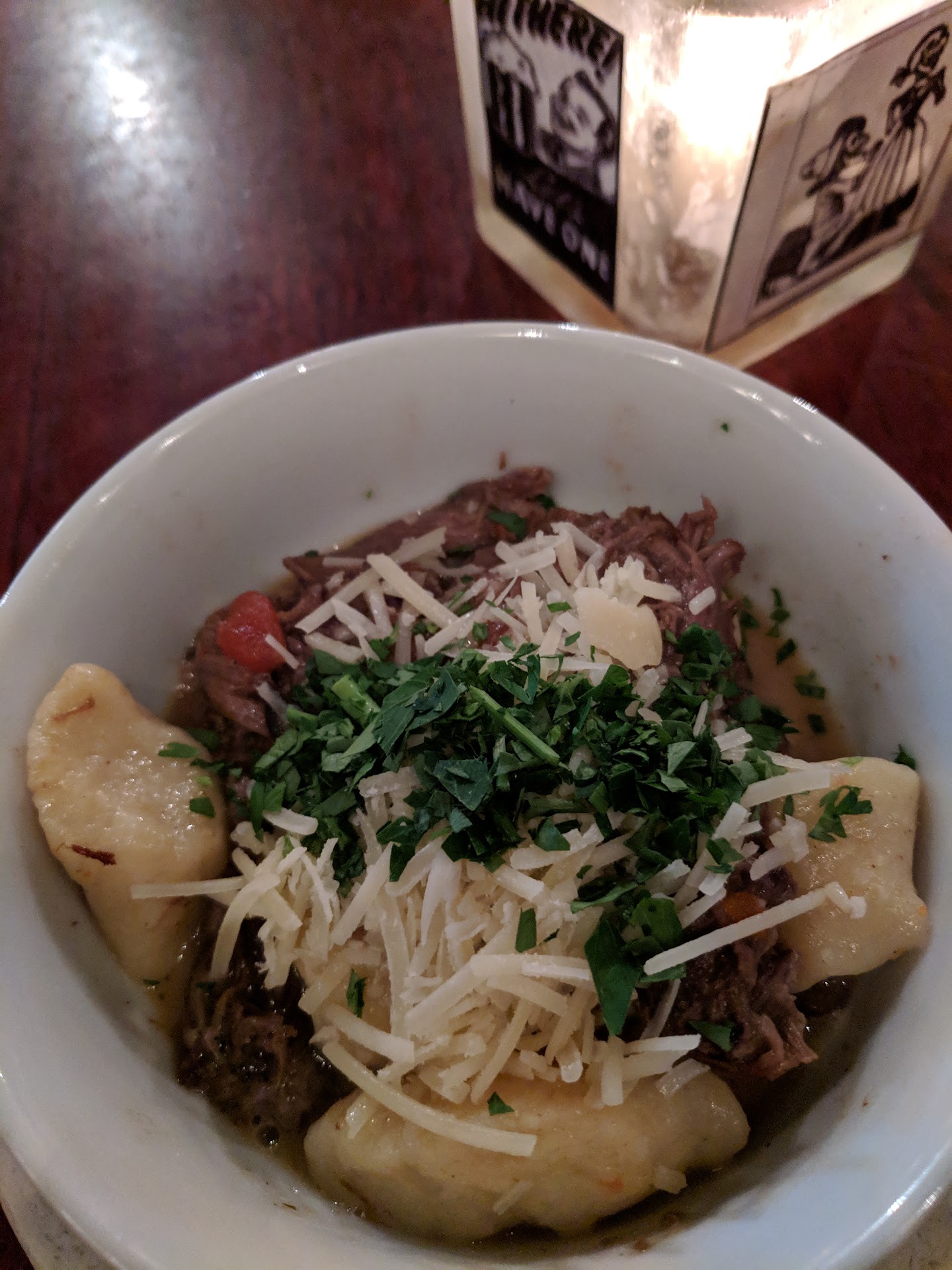 We ordered the Short Rib Gnocchi appetizer, which turned out to be really bad -- it was a flavorless stew. We also ordered the burger w/side of mac and cheese, both of which were pretty good. The food came out quickly, and was hot, but we were very disappointed by the lack of flavor in the gnocchi appetizer.