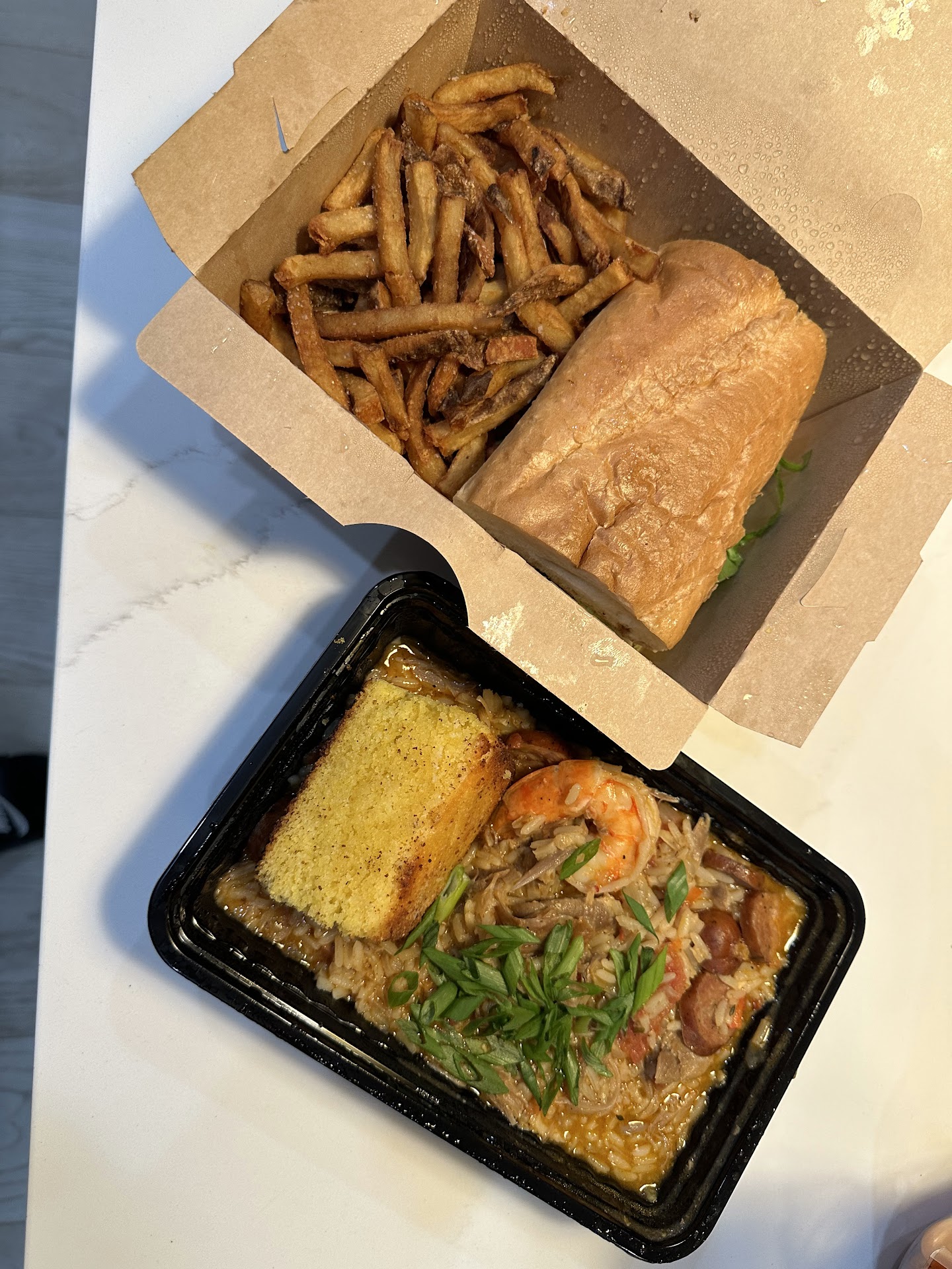 We appreciated being seated quickly by a friendly and direct manager-type. Our server, though, was quick, quiet, and a bit cold. Our group of 5 ordered a bunch of food. The Mozz + Ricotta Fritters were STUPID good, the Fried Plantains were bomb, and the Catfish Po' Boy was great too. There was also Gazpacho, a Caesar with Shrimp, and a Shredded Kale & Brussels Salad (sadly pretty dry).