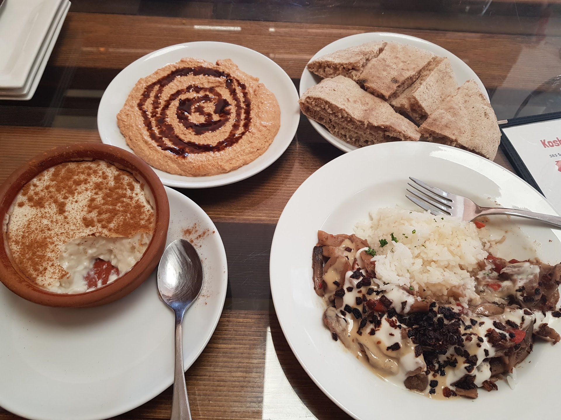 For the main dishes, mushroom shawerma was acceptable as a "mushroom with rice" dish. I liked the idea of making stripes of mushroom and sauté it in shawerma spice, but this dish didn't taste shawerma whatsoever. I can understand that the texture and not using meat may affect the flavor, but to be completely different flavor means non-shawerma spices were used. The taste was good, but it should be called something else. It was also a bit salty, which impacted the flavor negatively. The rice was a bit dry and had a bite to it. I give this dish 6 out of 10, taking a point out for each lack of true shawerma flavor, bity rice, being salty, and for being pricey for such experience (essentially $24 for salty sautéed mushroom).