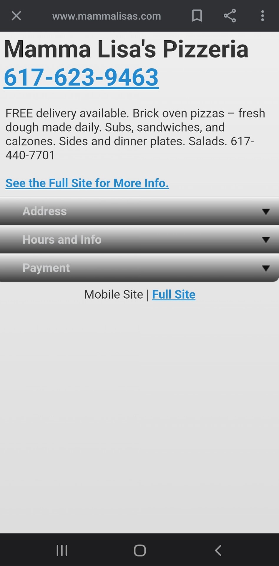 But, heads up...if you Google search for the correct website/menu (as the woman on the phone suggested) that likely won't give you the right result either. When I tried to look for menu items and prices on what i was led to believe was the right website I was given a redirect page to "Slice!" which is some kind of delivery service, but the catch is that Mamma Lisa's no longer partners with Slice — so i was prompted to "search for another pizzeria near me" and couldn't find a way around that to just look at Mamma Lisa's menu.