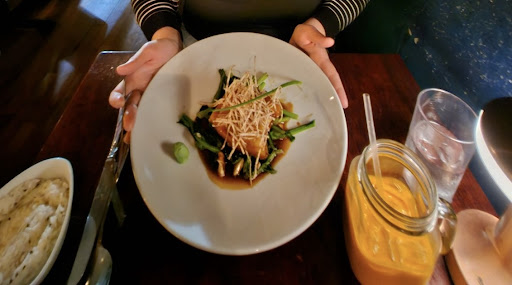 We started with the Vietnamese rice ravioli roll which was by far the highlight of our meal. It’s a mixture of mushroom and assorted veggies that are rolled into a rice sheet, steamed, and served with a delicious brown soy-like sauce and crispy onions. Delectable, do not skip this. We ordered a red curry and thai basil veggies entree to share. These were also very good— crisp veggies in the entree, velvety coconut forward broth in the curry. Service was quick to serve and pick up.