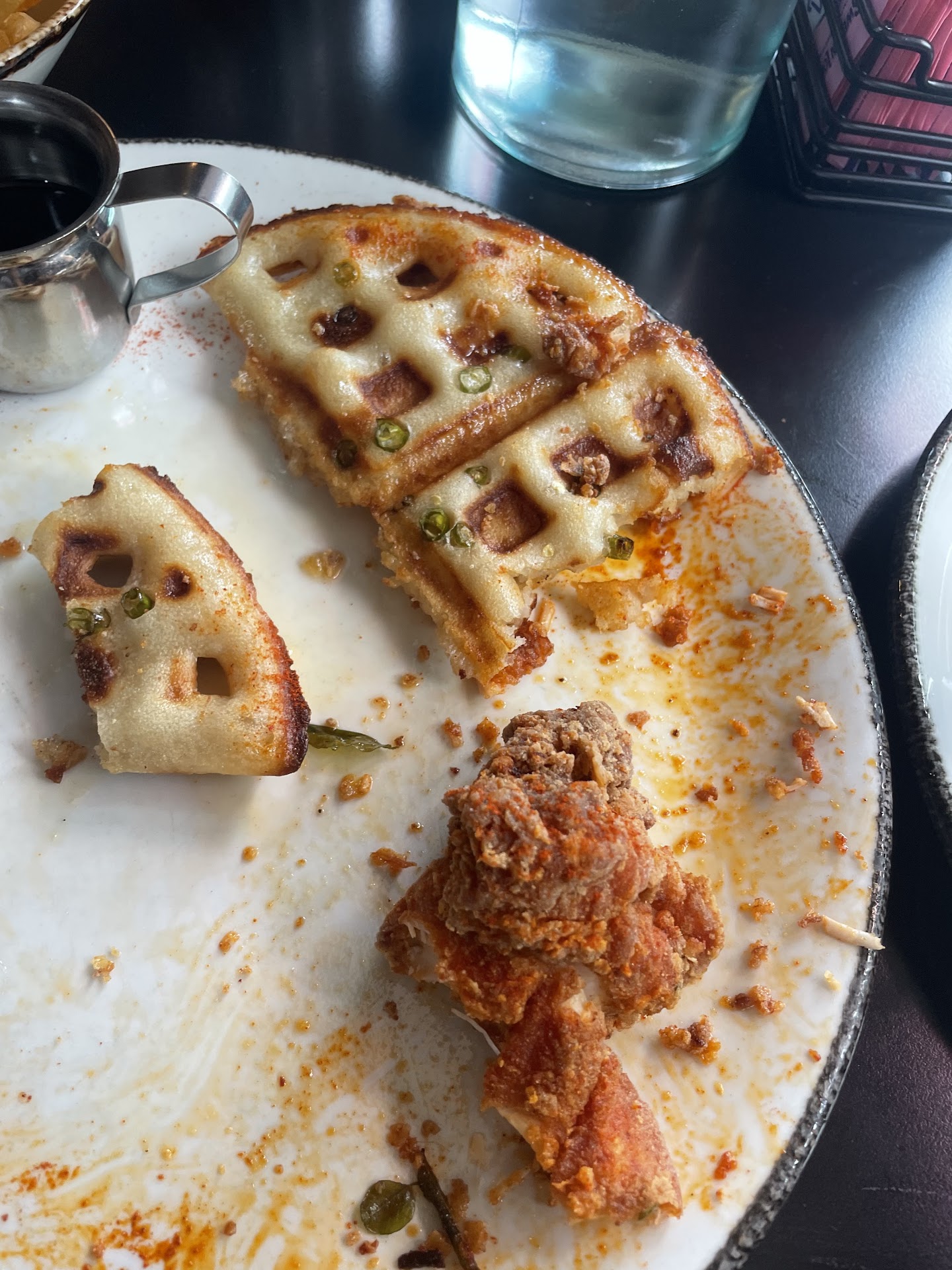 The gluten free waffle was also barely edible (couldn’t even bite through it, honestly as plasticky as it looks in the image, unfortunately), but even worse, we suspect that the chicken wasn’t actually gluten free. After raising our concerns to the manager, we were assured that gluten, nut, meat, etc. containing foods are prepared in separate fryers, but this doesn’t seem believable, as our gluten free member experienced significant negative symptoms indicative of having consumed gluten.