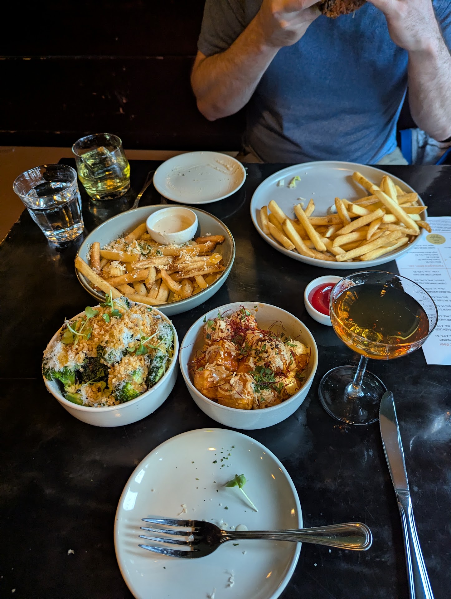 We had a fabulous dinner at Tall Order. The cocktails were phenomenal. Very well balanced, using bottles we were unfamiliar with so a nice treat. We also had the low-abv Little Panda, which was very good. Next time we will try some of their NA cocktails, but they all sounded interesting. The food was excellent as well. I had the rosemary fries and freicracker tofu, which were both outstanding. The real show stopper for me was the grilled broccoli--I couldn't get enough of it! My husband had the kaarage chicken sandwich and said it was good though it did fall apart a bit as he ate. Lastly, the service deserved everyone one of the five stars I gave. My water glass was never empty and our server was polite, well-informed on the menu, and attentive to ask about allergies. The noise level was also reasonable, which I mention because I'm sensitive to loud noises and get annoyed by noisy restaurants where I can't hear the person sitting across from me. Overall, I...