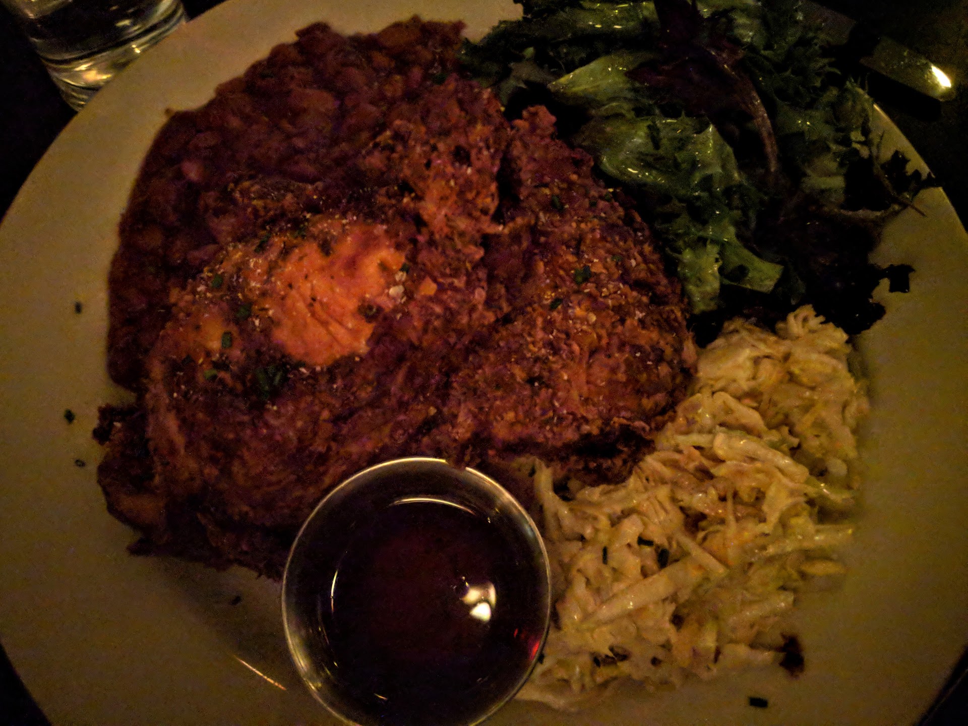 For my entree, I got the Fried Chicken. The breading on the chicken was actually very good on its own. Pairing with the sauce (sweet, and served on the side) was quite enjoyable. The kicker is this, though: the waitress offered, and I accepted, some Crystal hot sauce. It brought the chicken to the next level by pairing the salty, sweet, and spicy. So I wonder, why wasn't this prepared this way out of the gate? The best flavor shouldn't be an option, at least I don't think so. My plate had two large pieces of chicken on it - one white and one dark meat (including a leg). The dark meat was really, really good, but the white meat suffered the fate of a lot large birds: a tad dry. Brining might have helped here. Along with the chicken and the sauce, the plate also had corn bread (hiding under the chicken), sweet baked beans, cole slaw, and an arugula salad. The cole slaw, I will be short, was so unremarkable that I think it was a waste of space on the plate. The corn bread was better, though maybe a bit dense compared to what I'm used to (I grew up South of the Mason-Dixon). Now, I'm going to be honest and say I'm not a huge fan of arugula - it's bitter. This salad was dressed with oil, salt, and pepper, and by itself just didn't impress. I found that adding some of the syrup/sauce that was intended for the chicken as a dressing additive really improved matters, though - so much so that I actually really liked the salad; so if you do get the chicken, try that out. The beans, lastly, I thought, were too sweet after the sweet sauce, sweet corn bread, and (admittedly by my own fault and also preference) sweet arugula salad. I wish they were more similar to a cowboy bean instead.